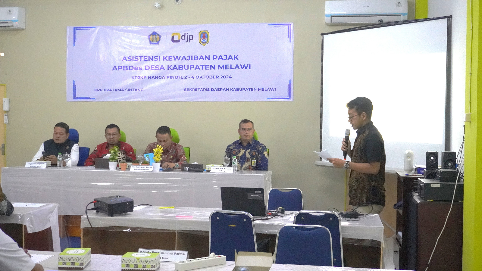 Kepala Kantor Pelayanan, Penyuluhan, dan Konsultasi Perpajakan (KP2KP) Nanga Pinoh bersama dengan Kepala Seksi Pengawasan IV Kantor Pelayanan Pajak (KPP) Pratama Sintang melaksanakan sosialisasi perpajakan kepada para perangkat Desa Kabupaten Melawi di Ruang Aula KP2KP Nanga Pinoh, Kabupaten Melawi (Jumat, 7/10).