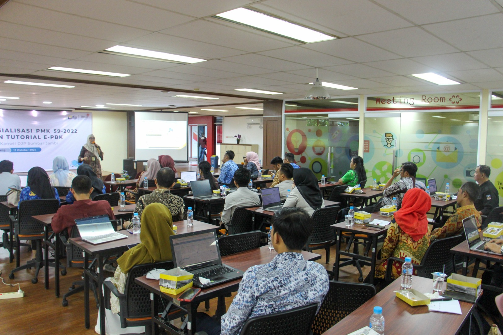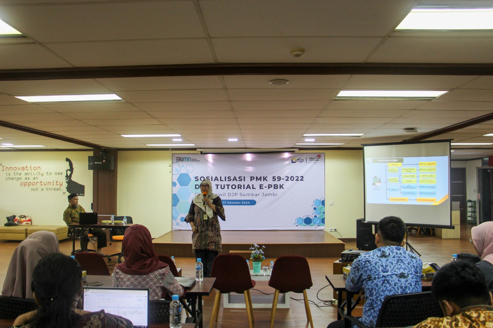 Kantor Wilayah Direktorat Jenderal Pajak (Kanwil DJP) Sumatera Barat dan Jambi menggelar edukasi perpajakan bagi instansi pemerintah dan rekanan PT Telkom Indonesia di Gedung Digital Innovation Lounge (DILo) Telkom Padang, Kota Padang (Kamis, 17/10). Peserta kegiatan ini meliputi bendaharawan instansi pemerintah dan badan usaha yang telah dikukuhkan sebagai Pengusaha Kena Pajak (PKP).