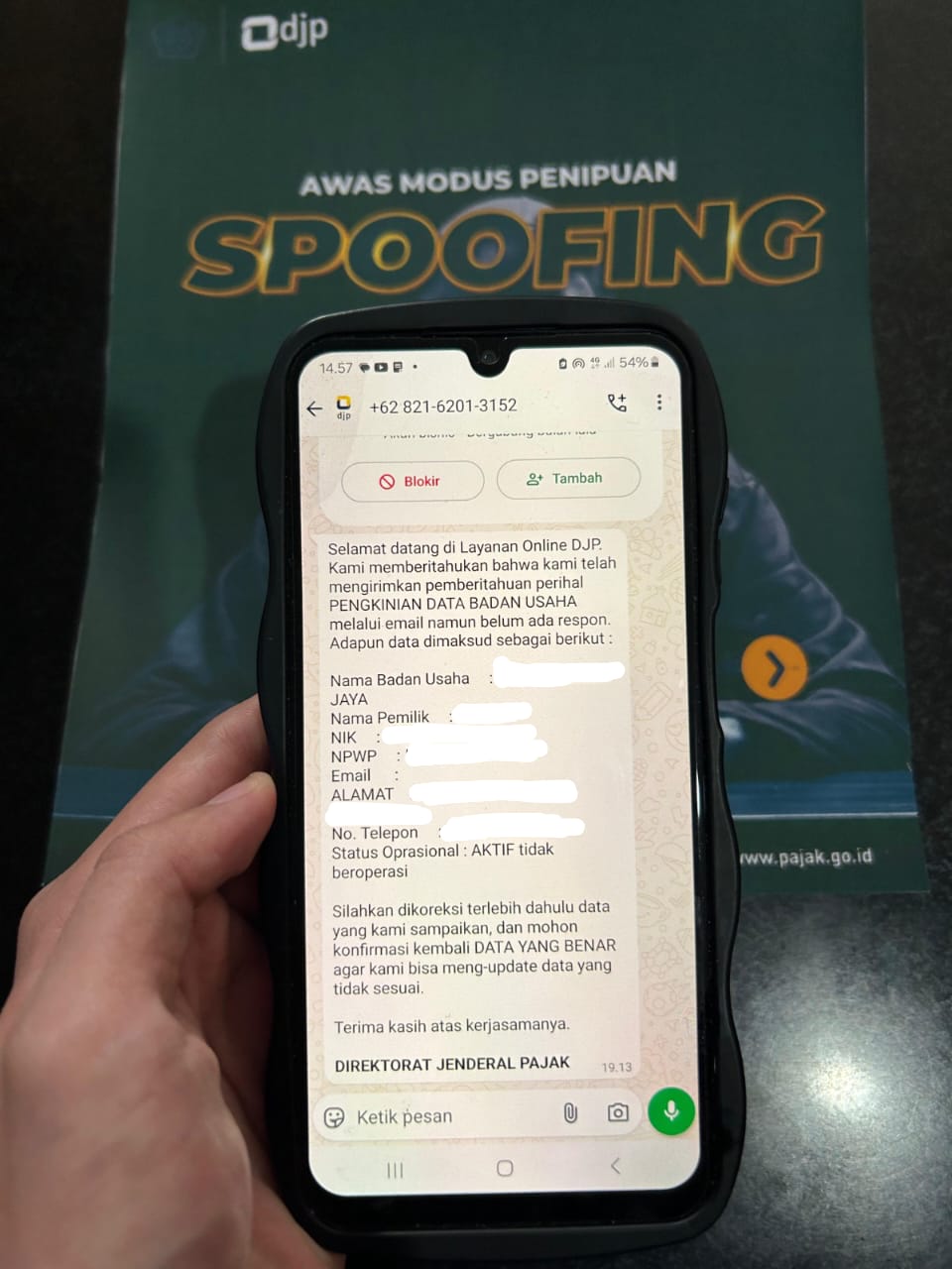 Radia melaporkan bahwa ia menerima pesan melalui WhatsApp dari seseorang yang mengaku sebagai pegawai kantor pajak. Dalam pesannya, oknum tersebut meminta Radia untuk melakukan konfirmasi terkait data kepesertaan program BPJS Kesehatan yang diikutinya. Radia yang merasa curiga lantas berinisiatif mendatangi KP2KP Enrekang guna memastikan kebenaran informasi tersebut.