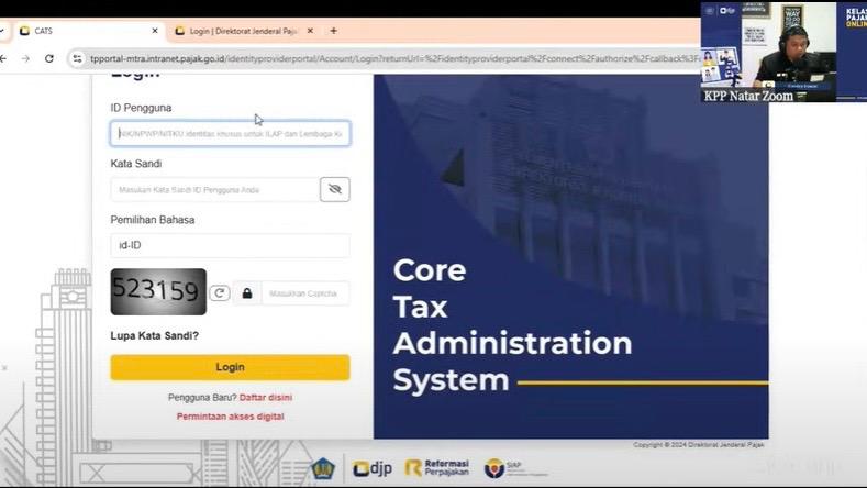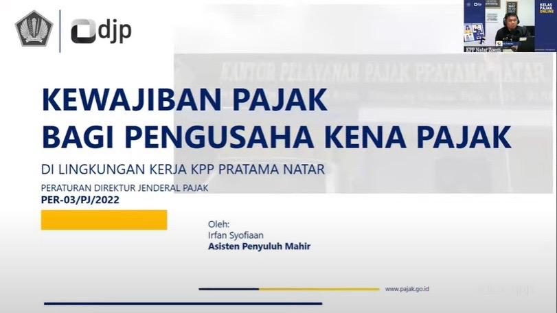 Kantor Pelayanan Pajak (KPP) Pratama Natar melaksanakan Kelas Pajak Edukasi Coretax dengan mengajak Wajib Pajak Pengusaha Kena Pajak (PKP) yang terdaftar di KPP Pratama Natar secara daring melalui aplikasi Zoom di Kabupaten Lampung Selatan, Lampung (Selasa, 10/12). Kelas pajak ini bertujuan untuk meningkatkan pemahaman dan pengenalan aplikasi Coretax kepada wajib pajak. Kegiatan ini berlangsung dari pukul 09.00 WIB sampai dengan 11.00 WIB.