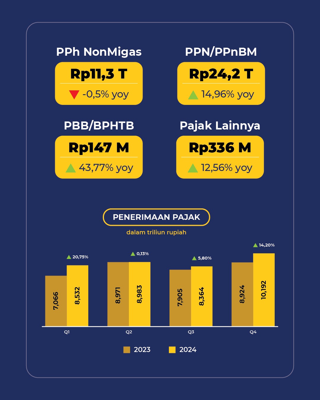 Dari sisi jenis pajak, penerimaan Pajak Penghasilan (PPh) mencapai Rp11,372 triliun atau 103,22% dari target yang ditetapkan. Secara keseluruhan, pertumbuhan PPh menunjukkan angka negatif sebesar 0,05%. Hal ini disebabkan oleh penurunan penerimaan PPh Badan yang mencatat angka 24,87%. Namun demikian, kinerja jenis pajak PPh lainnya, seperti PPh Orang Pribadi dan PPh Pasal 21 berhasil tumbuh rata-rata sebesar 19%, yang membantu menjaga stabilitas penerimaan dari sektor ini. Sementara itu, Pajak Pertambahan Nilai (PPN) dan Pajak Penjualan atas Barang Mewah (PPnBM) mencatat penerimaan sebesar Rp24,576 triliun, atau 98,54% dari target. Pertumbuhan penerimaan sebesar 14,96% menunjukkan peran besar PPN Dalam Negeri dan PPN Impor dalam mendukung penerimaan.