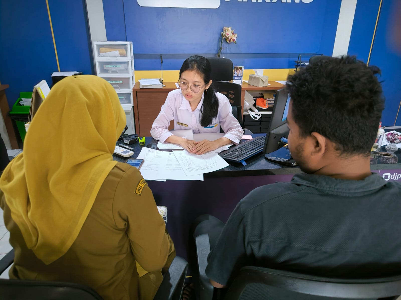 Kantor Pelayanan, Penyuluhan, dan Konsultasi Perpajakan (KP2KP) Pinrang menerima kedatangan seorang pengusaha yang ingin memenuhi kewajiban perpajakannya di Loket Helpdesk KP2KP Pinrang, Kabupaten Pinrang (Senin, 16/6).
