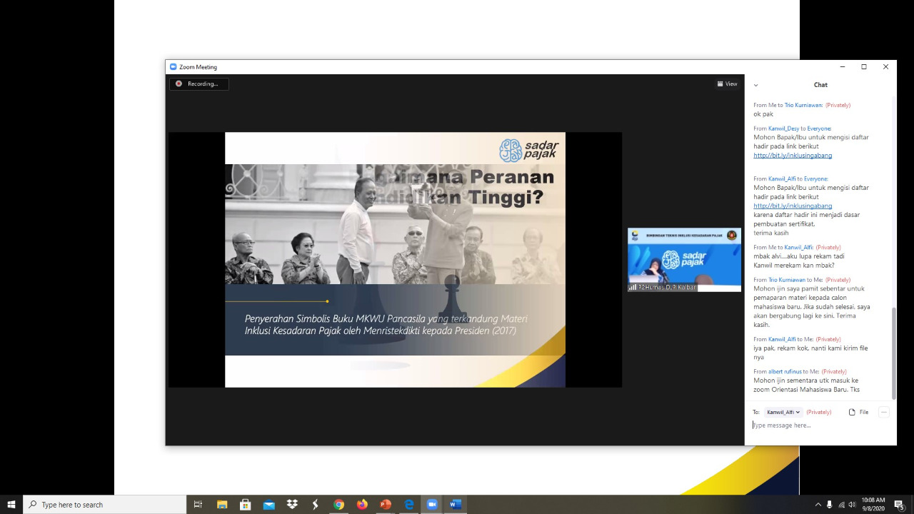 Kepala Seksi Bimbingan Penyuluhan R. Desy Andriyani selaku narasumber mengucapkan terimakasih atas partisipasi aktif dari para dosen yang terlibat dalam webi ini. Desy berujar kegiatan inklusi ini bertujuan agar para dosen dapat mengenalkan pajak kepada para mahasiswa dalam mata kuliahnya. Ia berharap agar semua mahasiswa sebagai generasi penerus bangsa dapat sadar dan taat pajak.