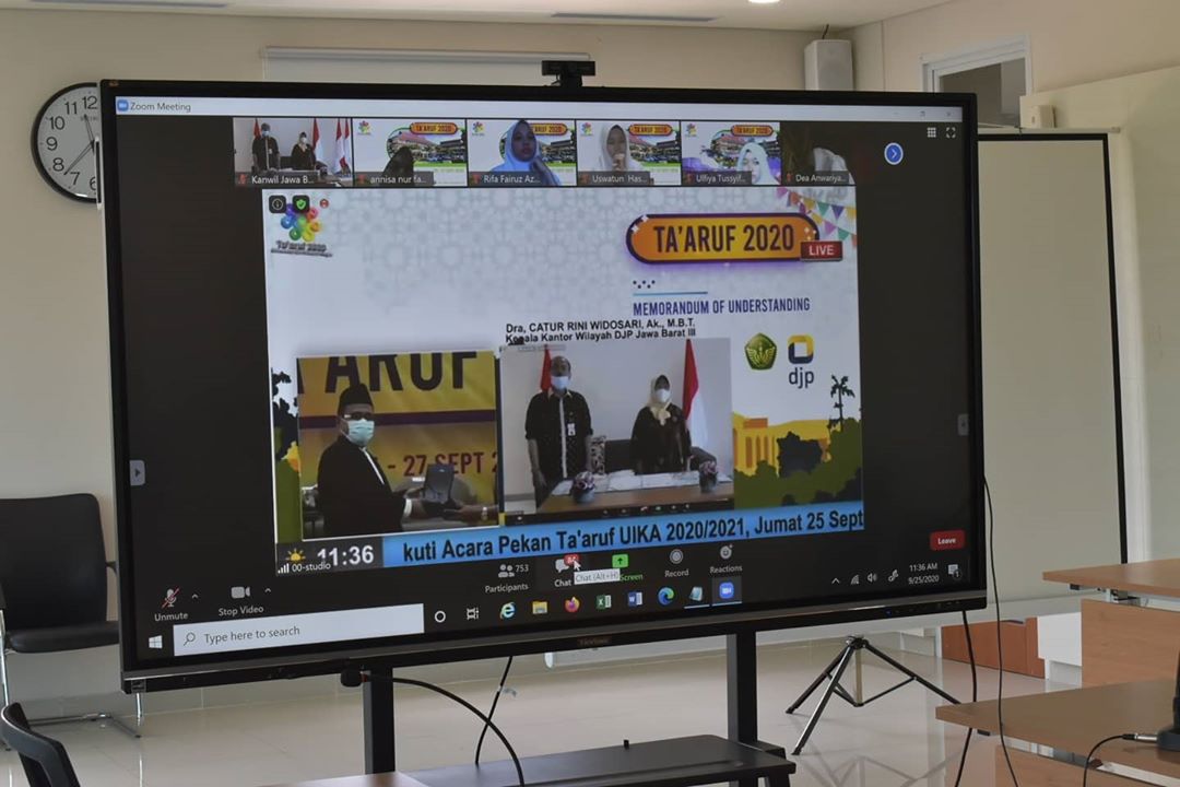 Didampingi oleh Kepala Bidang P2Humas, Kepala Kanwil DJP Jawa Barat III tanda tangani kerja sama secara daring melalui telewicara di Aula Gedung Kanwil dalam acara Taaruf Mahasiswa Baru Universitas Ibn Khaldun.