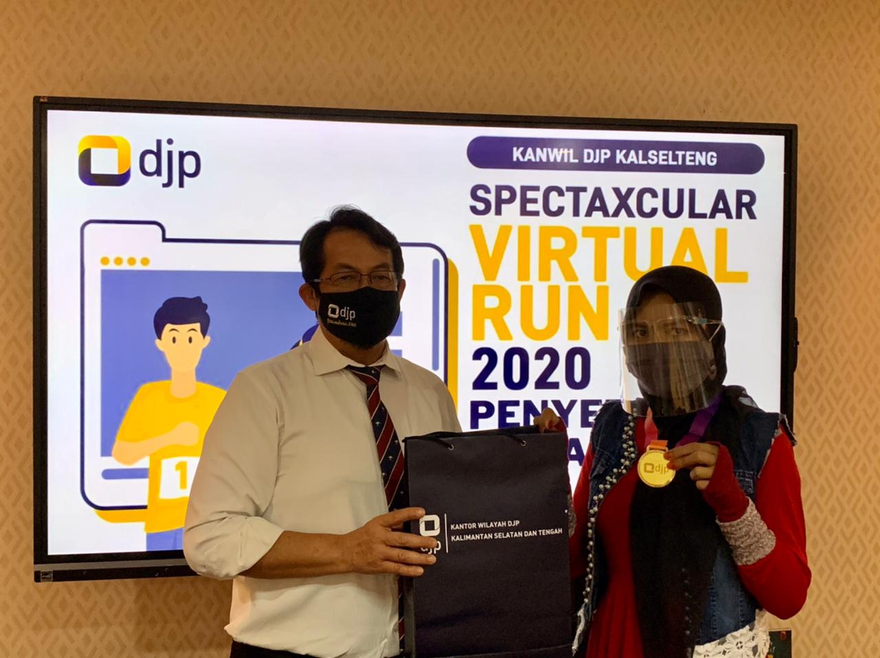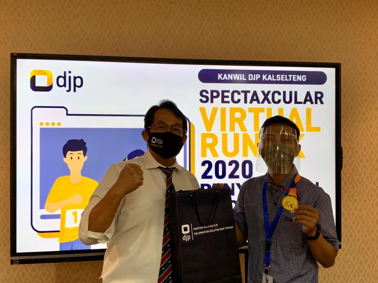 Kakanwi DJP Kalimantan Selatan dan Tengah (Kalselteng) Cucu Supriatna menyerahkan medali Spectaxcular Virtual Run 5K kepada dua orang perwakilan peserta di Kanwil DJP Kalselteng, Banjarmasin (Senin,18/1). Penyerahan medali ini merupakan puncak acara dari Spectaxcular Virtual Run 5K yang dilaksanakan pada tanggal 24 hingga 31 Desember 2020.