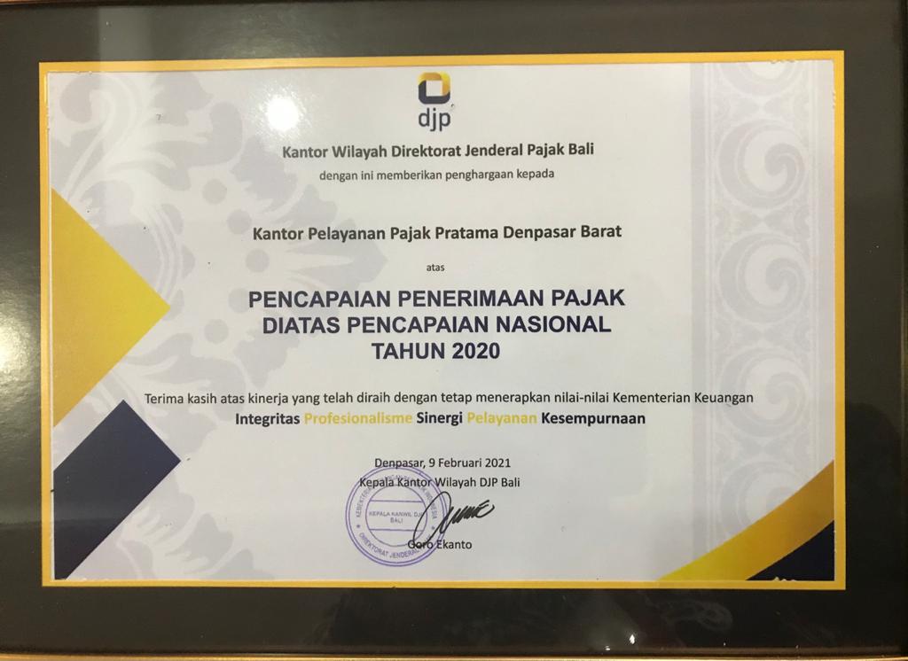 Penyerahan penghargaan dilakukan oleh kepala Kanwil DJP Bali Goro Ekanto kepada kepala KPP Pratama Denpasar Barat Nyoman Ayu Ningsih. Dua penghargaan tersebut terdiri atas Pencapaian Penerimaan Pajak Diatas Pencapaian Nasional Tahun 2020 dan Pencapaian Target Effort Tertinggi di Lingkungan Kanwil DJP Bali Tahun 2020. Kepala KPP Denpasar Barat berharap dengan adanya penghargaan ini dapat menambah motivasi seluruh pegawai untuk bekerja dengan baik dan menjunjung tinggi nilai-nilai kementerian keuangan.