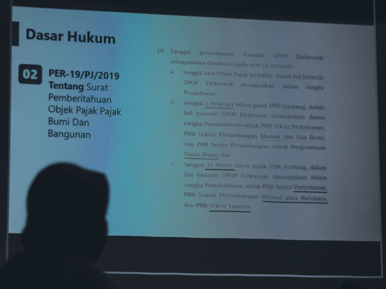 Kegiatan ini berdasarkan atas Peraturan Direktur Jenderal Pajak Nomor PER-19/PJ/2019 tentang Surat Pemberitahuan Objek Pajak Pajak Bumi dan Bangunan. Dalam peraturan tersebut, mekanisme penyampaian Surat Pemberitahuan Obyek Pajak (SPOP) Bumi dan Bangunan dilakukan menggunakan saluran elektronik.