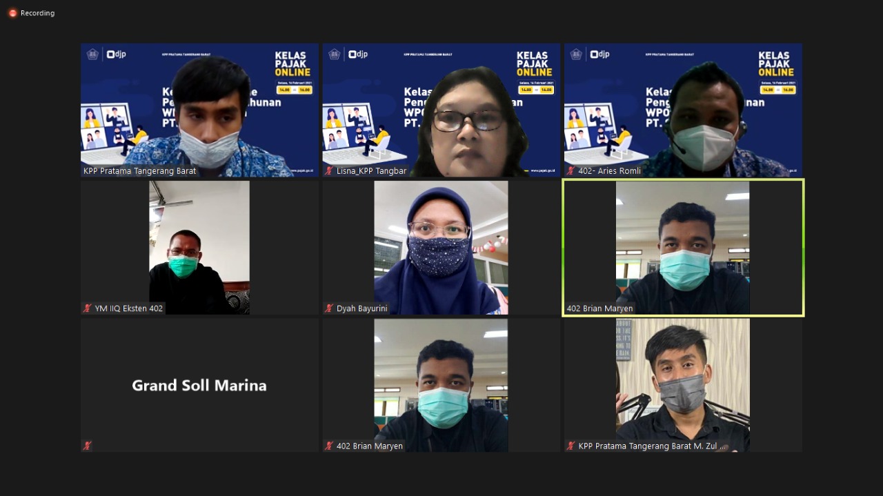 KPP Pratama Tangerang Barat mengadakan Kelas Pajak bagi karyawan Grand Soll Marina Hotel melalui media aplikasi zoom cloud meeting dengan materi tentang pengisian SPT Tahunan yang berlangsung selama satu jam dengan narasumber Account Representative KPP Pratama Tangerang Barat, Brian Maryen (Selasa, 16/2).
