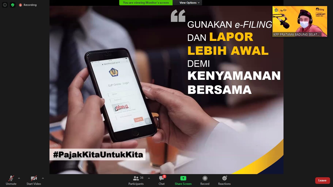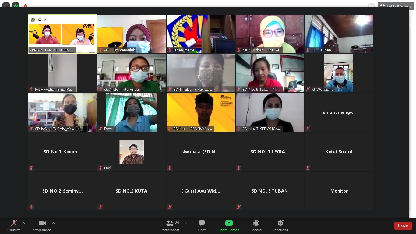 Kantor Pelayanan Pajak (KPP) Pratama Badung Selatan mengadakan sosialisasi Tata Cara Penerbitan Bukti Potong 1721 A1/A2 dan Tata Cara Pelaporan SPT Tahunan Karyawan melalui e-Filing kepada Bendahara BOS UPT Disdikpora Kecamatan Kuta secara daring di Bali (Kamis,18/2).