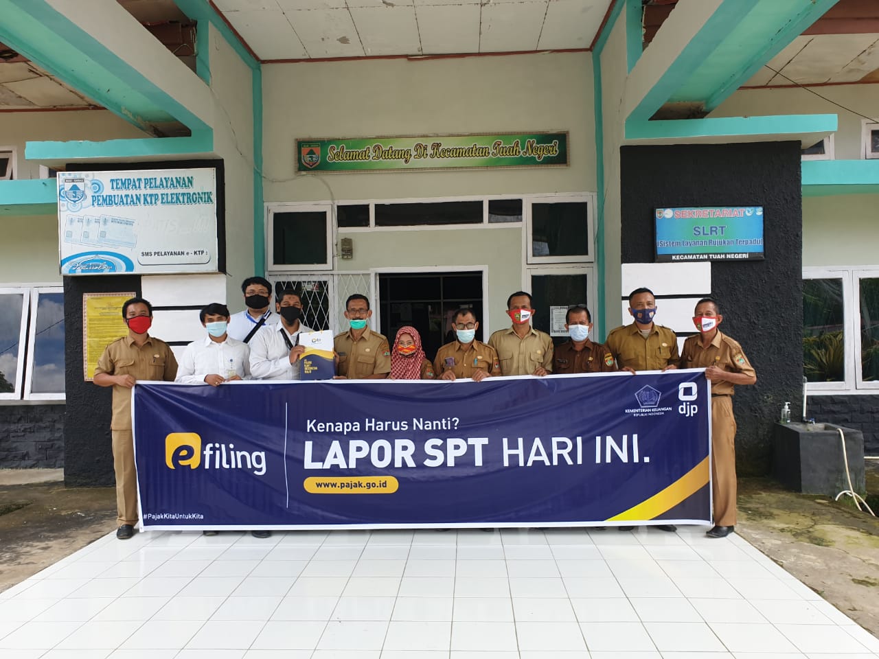 Tiga pegawai KPP Pratama Lubuklinggau mendatangi Kantor Kecamatan Tuah Negeri, Kabupaten Musi Rawas, untuk melakukan asistensi pengisian SPT (Senin, 1/3). Mengingat situasi pandemi, kegiatan dilakukan dengan mengikuti protokol kesehatan. Asistensi ini dilakukan karena banyak pegawai kecamatan belum melaporkan SPT Tahunannya.