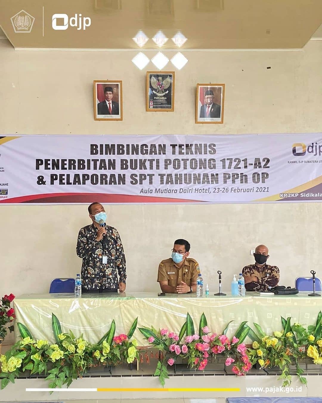 Kantor Pelayanan Pajak (KPP) Pratama Kabanjahe bersama dengan Kantor Wilayah (Kanwil) DJP Sumatera Utara II dan Kantor Pelayanan, Penyuluhan dan Konsultasi Perpajakan (KP2KP) Sidikalang menggelar bimbingan teknis (bimtek) penerbitan bukti potong 1721-A2 dan pelaporan SPT Tahunan PPh Orang Pribadi kepada seluruh bendahara sekolah Dinas Pendidikan Kabupaten Dairi di Aula Hotel Mutiara Dairi, Kabupaten Dairi (Selasa, 23/2).