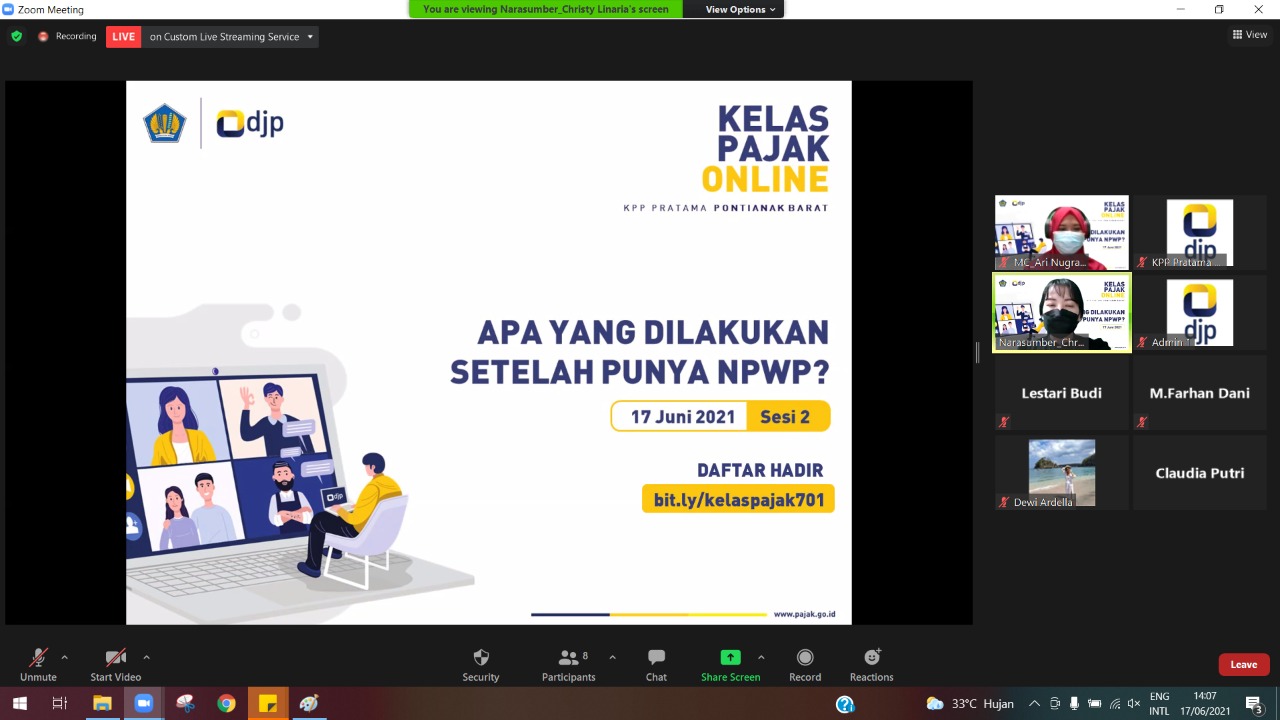 Kantor Pelayanan Pajak (KPP) Pratama Pontianak Barat mengadakan kelas pajak daring bertajuk “Apa yang Dilakukan Setelah Punya NPWP” kepada wajib pajak yang baru mendaftarkan diri di tahun 2021 (Kamis, 17/6). Kegiatan yang diselenggarakan melalui media Zoom Meeting dan Youtube ini dipandu dari gedung KPP Pratama Pontianak Barat dan diikuti oleh seluruh peserta di tempat masing-masing.