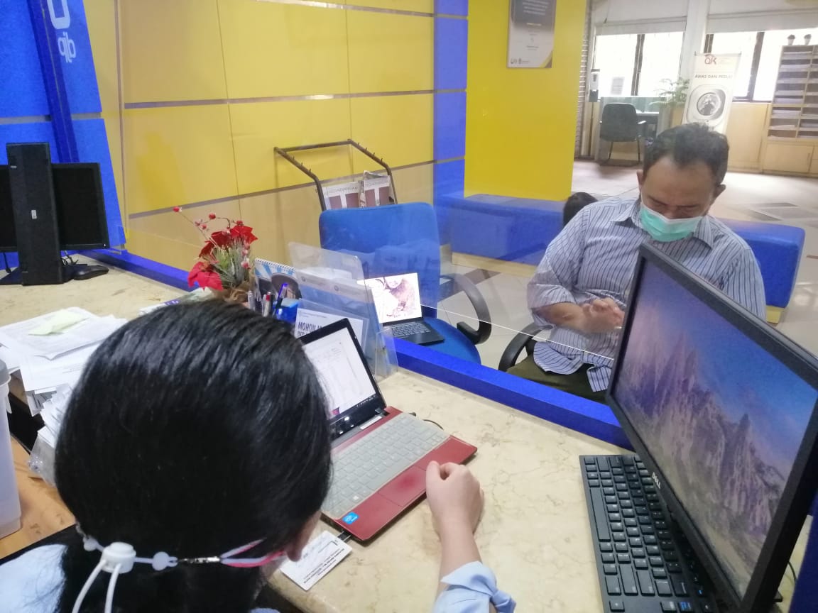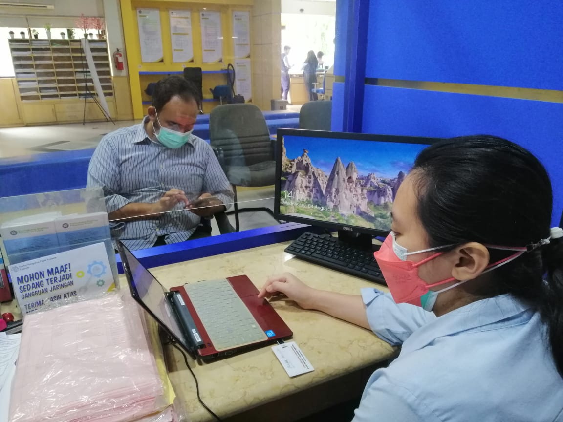 Wajib pajak diwajibkan untuk mendaftar antrean melalui kunjung pajak sebelum kedatangan. Layanan semi tatap muka dilakukan dengan metode penyaringan melalui dropbox untuk layanan loket TPT. Pengarah layanan memeriksa kesesuaian nama dan identitas wajib pajak, memeriksa suhu tubuh, melakukan scan UV sterilization terhadap berkas dan meneruskan berkas yang akan diproses ke petugas loket.