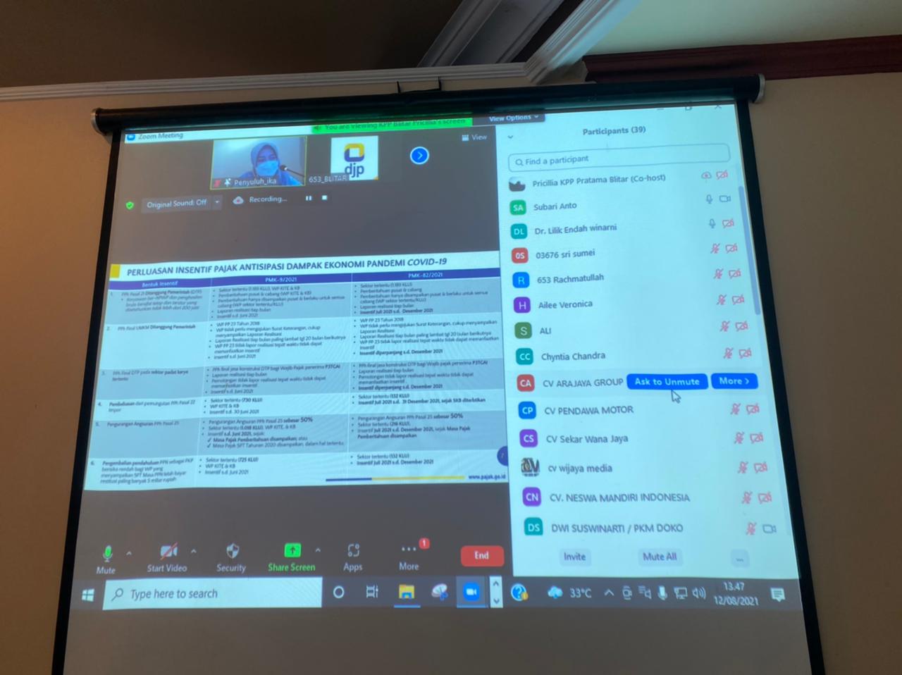 Kantor Pelayanan Pajak (KPP) Pratama Blitar mengadakan kelas pajak bagi wajib pajak terdampak pandemi Covid-19 di Blitar (Kamis,12/8). Dilaksanakan secara daring, kelas pajak ini diikuti oleh 47 Wajib Pajak Orang Pribadi dan Badan melalui media aplikasi Zoom Meeting dari ruang rapat KPP Pratam Blitar, Kota Blitar.
