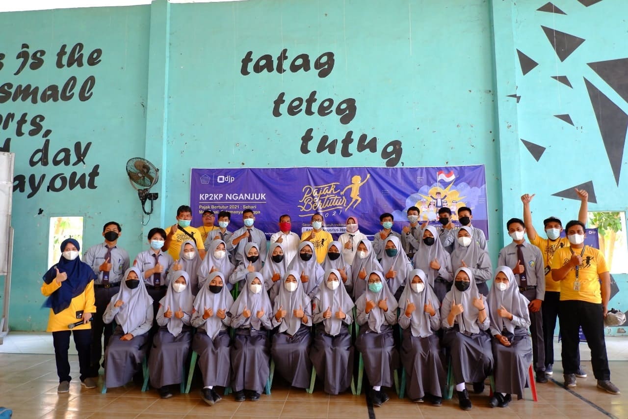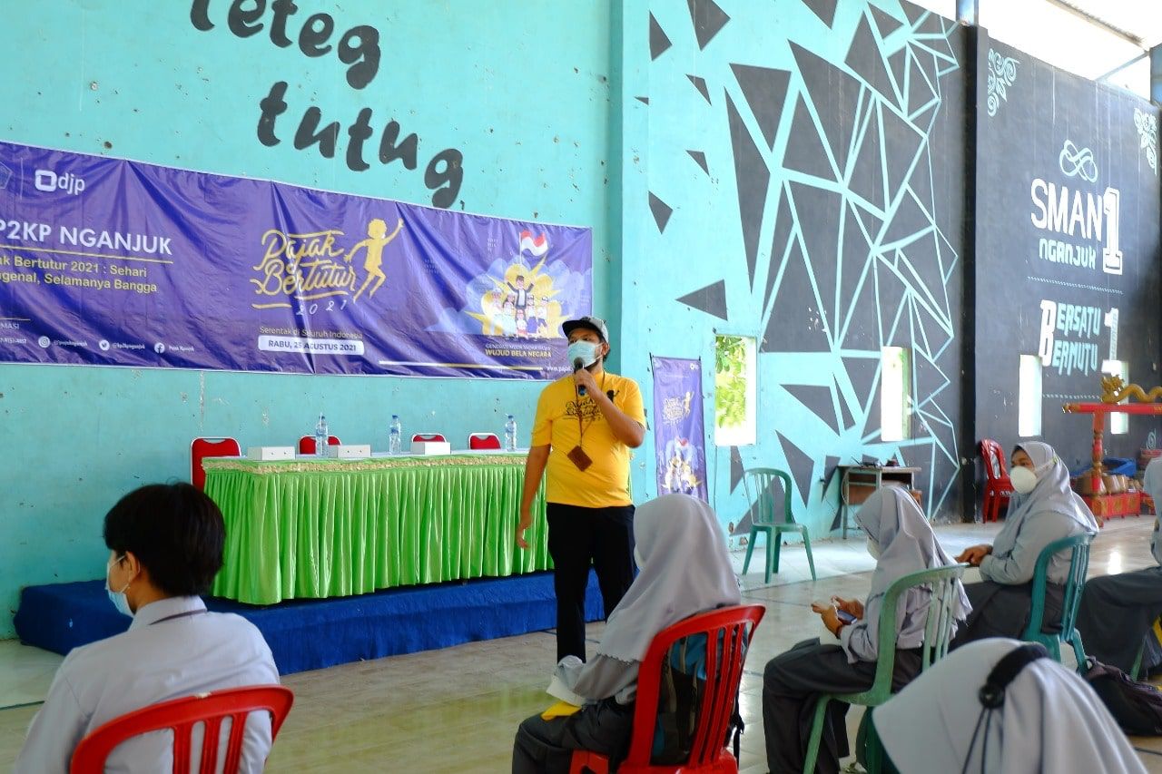 Kantor Pelayanan, Penyuluhan, dan Konsultasi Perpajakan (KP2KP) Nganjuk dan Kantor Pelayanan Pajak (KPP) Pratama Pare menyelenggarakan Pajak Bertutur di aula Sekolah Menengah Atas Negeri (SMAN) 1 Nganjuk, Kabupaten Nganjuk (Rabu, 25/8). Pajak Bertutur yang bertema “Sehari Mengenal, Selamanya Bangga” ini diikuti oleh 31 siswa kelas 11 SMAN 1 Nganjuk.