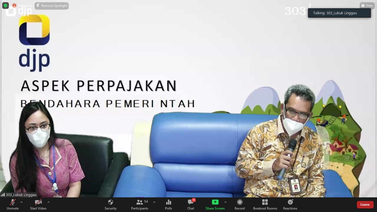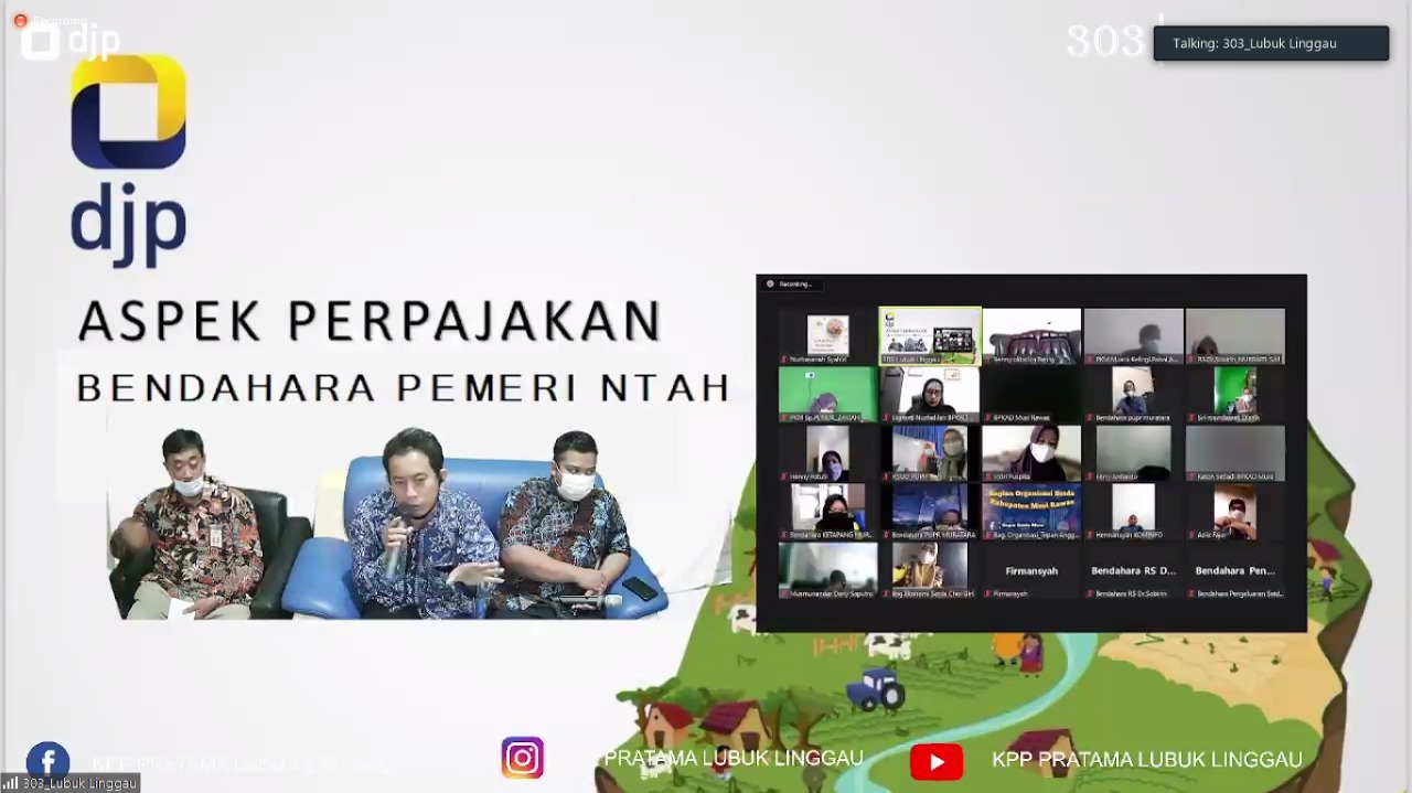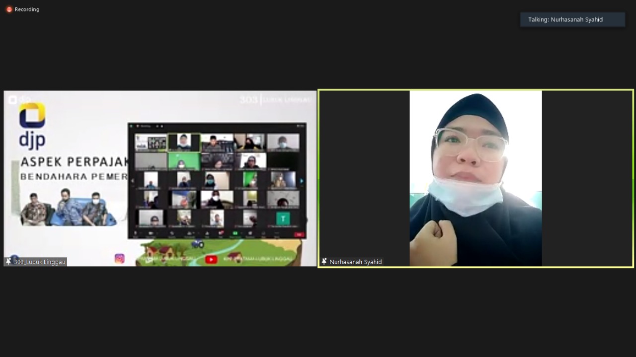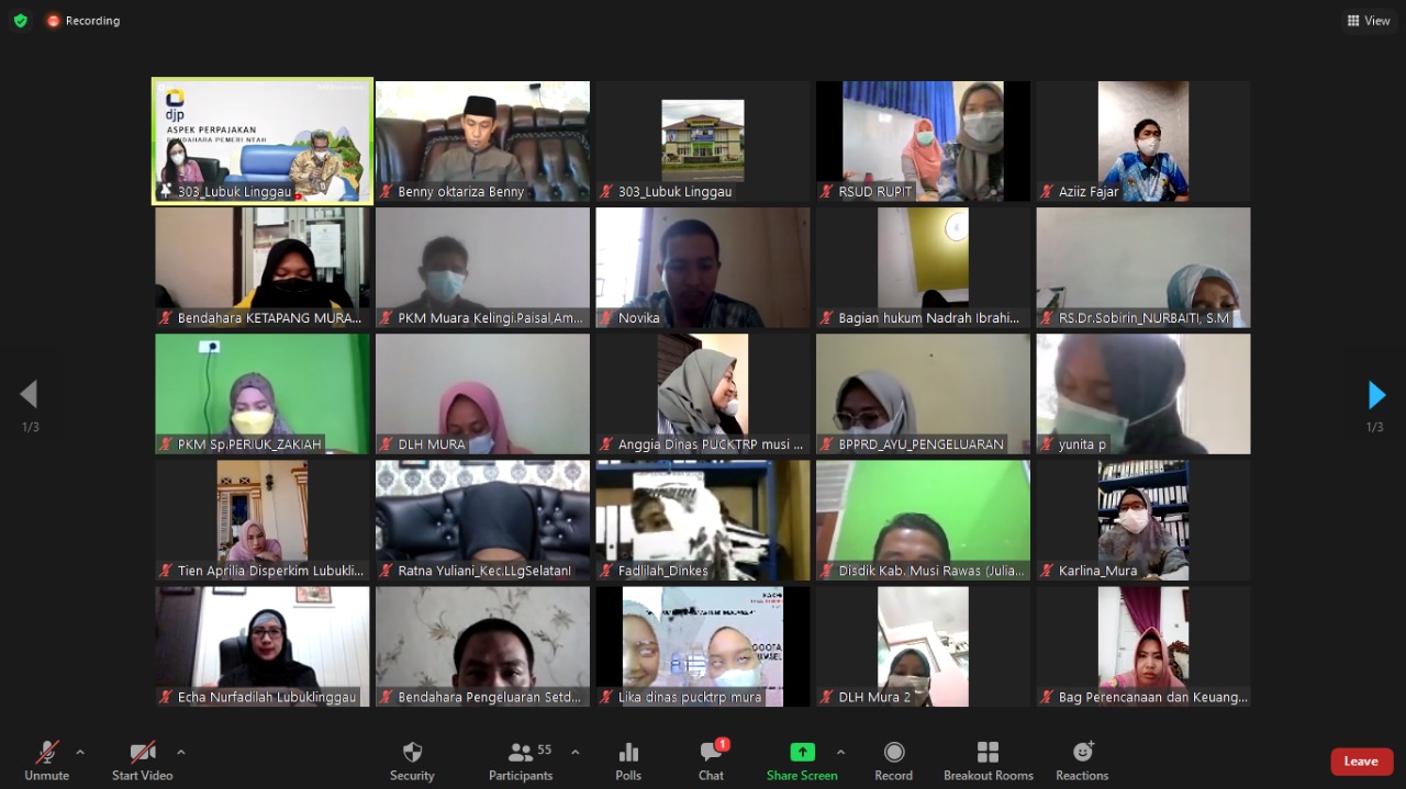 Sebanyak 50 bendahara pemerintah dari wilayah Kota Lubuklinggau, Kabupaten Musi Rawas, dan Kabupaten Musi Rawas Utara ikut serta dalam kegiatan penyuluhan yang diselenggarakan Kantor Pelayanan Pajak (KPP) Pratama Lubuk Linggau secara daring melalui Zoom Meeting (Jumat, 27/8).