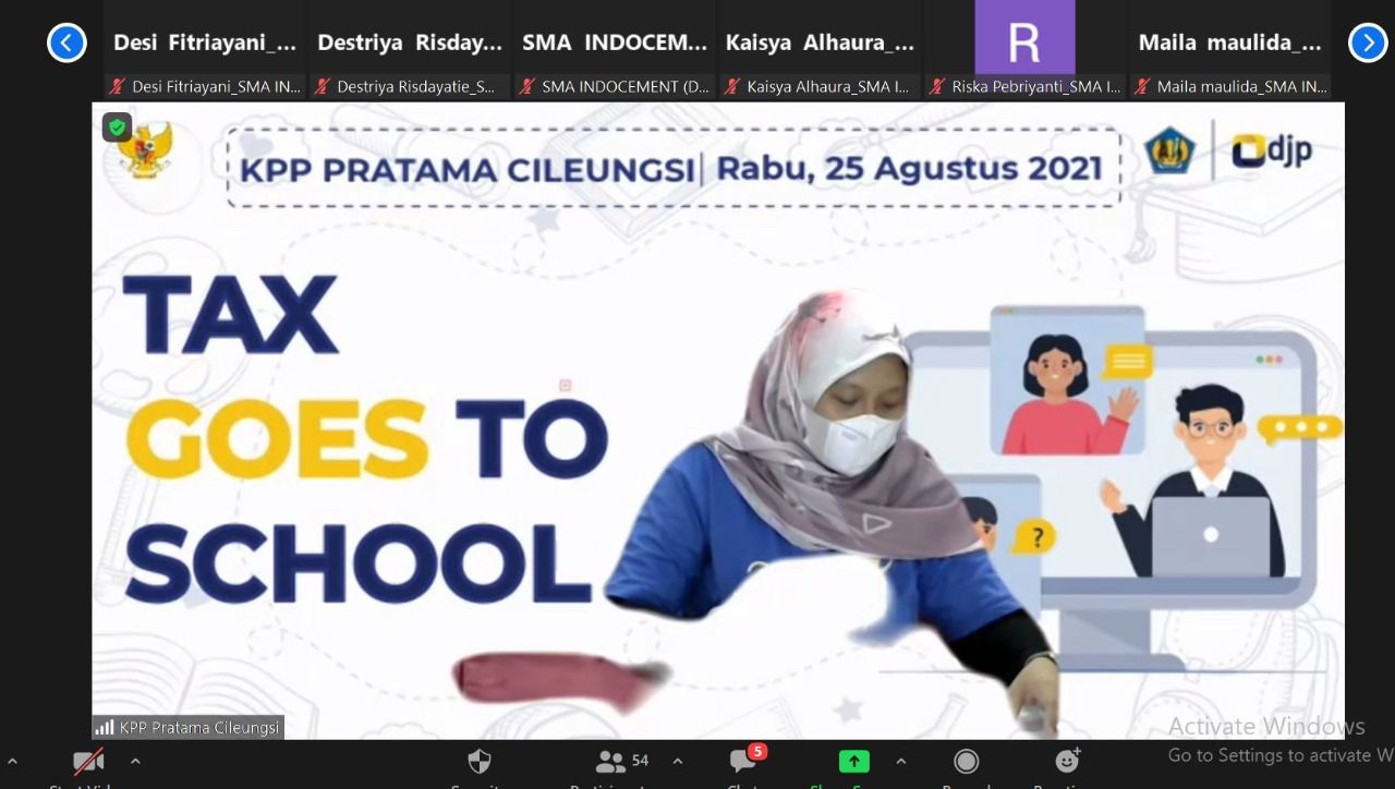 Selama pukul 13.00 hingga 15.00 WIB, sebanyak 52 siswa-siswi SMA Indocement kelas XII mendengarkan materi yang disampaikan oleh Fungsional Penyuluh Pajak KPP Pratama Cileungsi Erna Rusvalita. Erna menyampaikan nilai-nilai kesadaran pajak kepada peserta yang merupakan Future Tax Payers. Selain pemaparan materi, peserta juga diajak untuk belajar dan bermain kuis pajak.