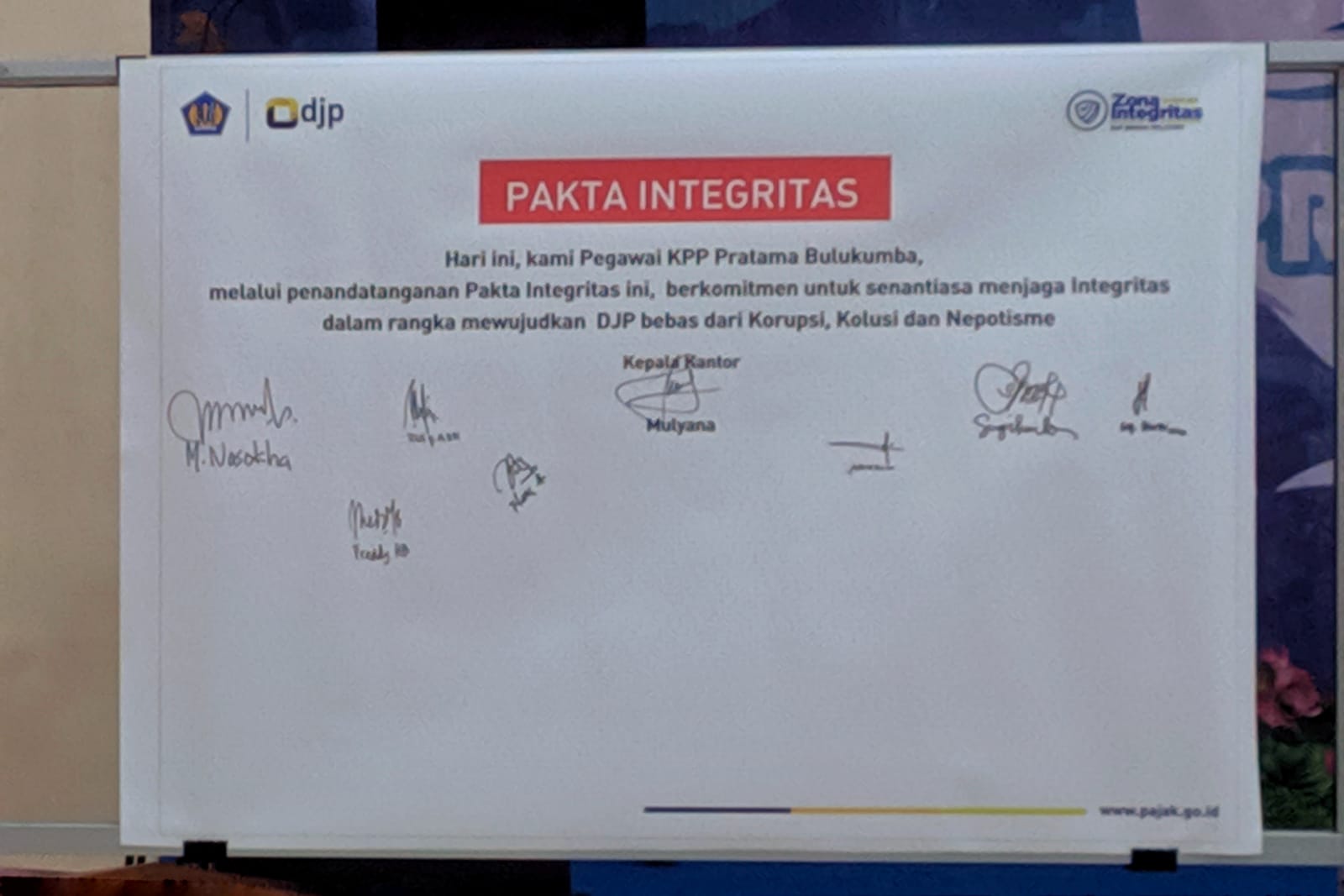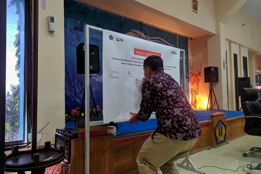 Pegawai Kantor Pelayanan Pajak (KPP) Pratama Bulukumba, Kantor Pelayanan Penyuluhan dan Konsultasi Perpajakan (KP2KP) Sinjai, dan KP2KP Benteng melaksanakan kegiatan penandatanganan pakta integritas di ruang aula KPP Pratama Bulukumba, Kabupaten Bulukumba (Selasa, 5/10). Kegiatan ini dipimpin secara langsung oleh Kepala KPP Pratama Bulukumba Mulyana yang disaksikan oleh sejumlah wajib pajak, pegawai KPP Pratama Bulukumba, pegawai KP2KP Sinjai, dan pegawai KP2KP Benteng.