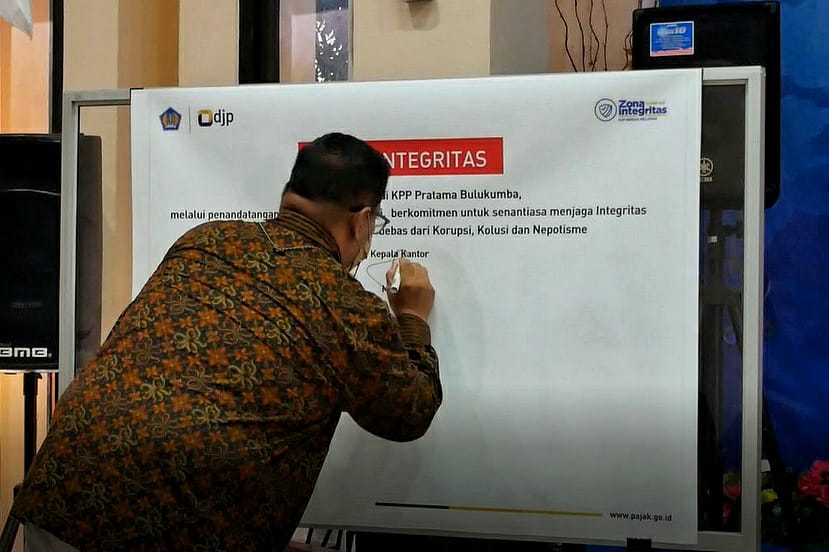 Kegiatan ini merupakan bagian dari pelaksanaan program Zona Integritas Menuju Wilayah Bebas Korupsi (ZI-WBK) yang telah dicanangkan oleh KPP Pratama Bulukumba. “Prosesi penandatanganan pakta integritas ini merupakan bentuk komitmen para pegawai KPP Pratama Bulukumba termasuk pegawai KP2KP Sinjai dan pegawai KP2KP Benteng selaku unit kerja di bawah KPP Pratama Bulukumba guna pembangunan Zona Integritas Menuju Wilayah Bebas Korupsi atau yang biasa kita singkat ZI-WBK,” ungkap Mulyana.