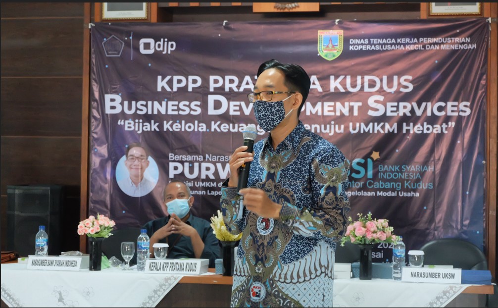 KPP Pratama Kudus bekerja sama dengan Dinas Tenaga Kerja, Perindustrian, Koperasi, dan Usaha Kecil Menengah (Disnaker Perinkop dan UKM) Kabupaten Kudus menyelenggarakan Business Development Service (BDS) di Aula Balai Latihan Kerja (BLK) Kudus (Selasa, 02/11)