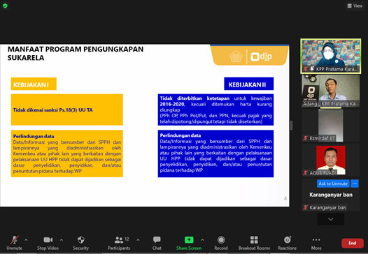 Kantor Pelayanan Pajak Pratama Karanganyar menggelar kelas pajak Program Pengungkapan Sukarela (PPS) melalui Zoom Meeting. (Rabu, 2/2). Kegiatan ini merupakan rangkaian kelas pajak yang diadakan secara rutin setiap hari Rabu hingga bulan Maret nanti. Peserta adalah wajib pajak orang pribadi yang terdaftar di KPP Pratama Karanganyar dan diisi oleh Tim Penyuluh Pajak. Dengan kegiatan ini KPP Pratama Karanganyar berharap wajib pajak akan lebih memahami prosedur dan manfaat PPS.