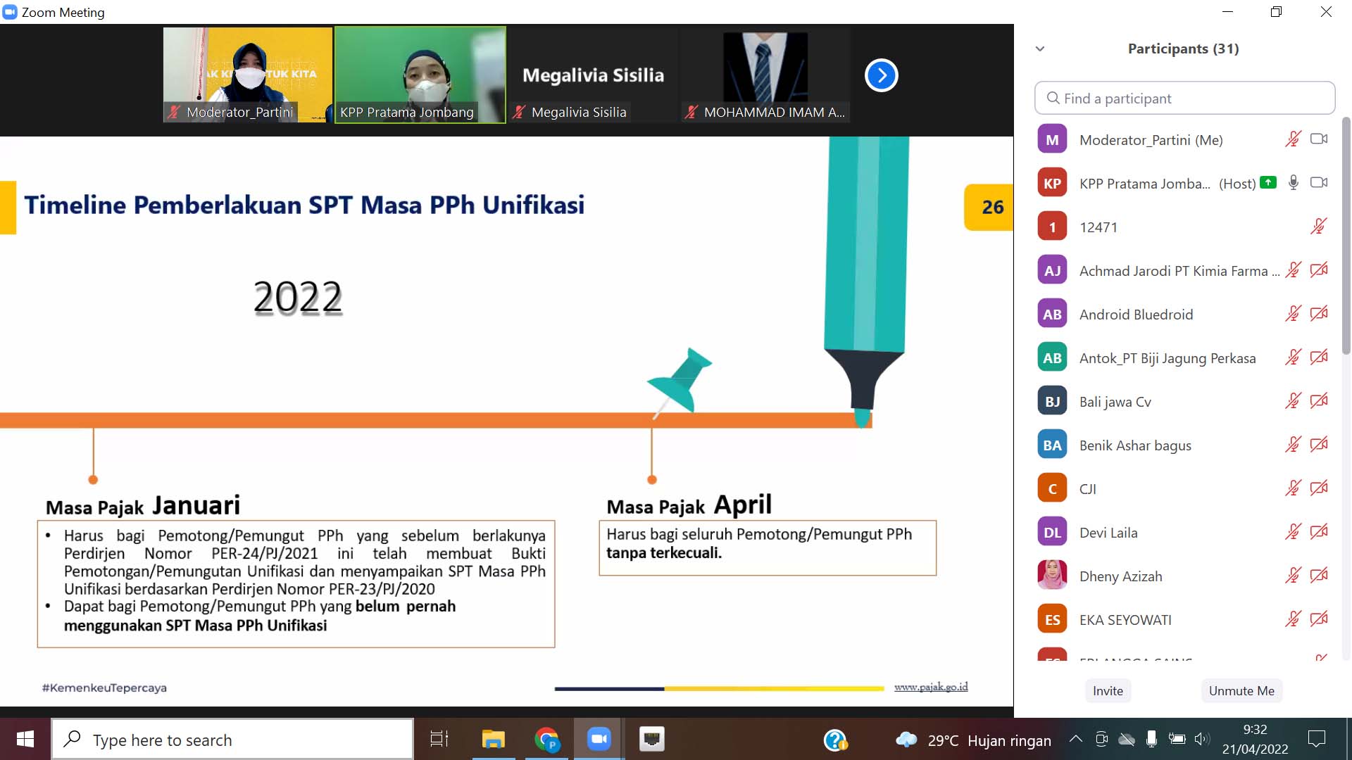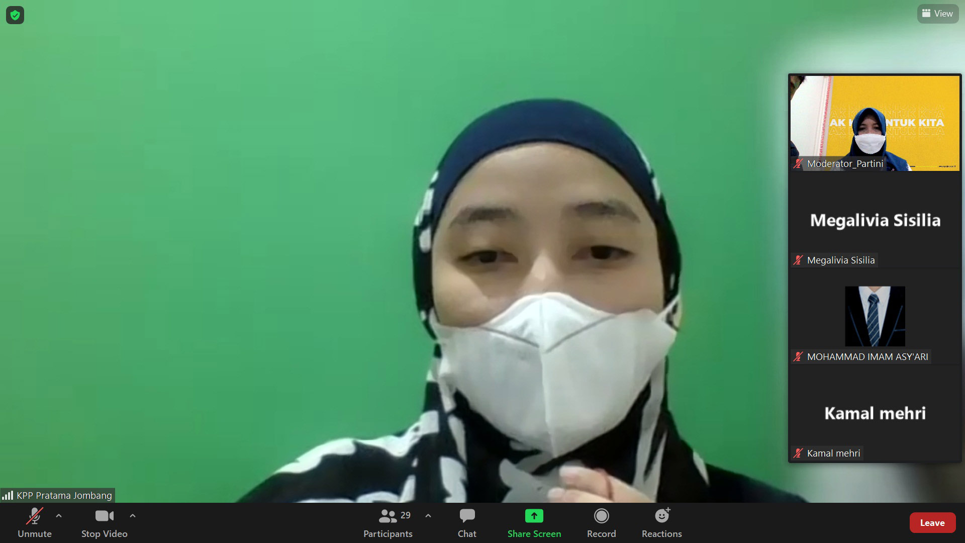 Kantor Pelayanan Pajak (KPP) Pratama Jombang menyelenggarakan bimbingan teknis tentang e-Bukpot Unifikasi yang diikuti oleh 30 Wajib Pajak Badan secara daring melalui zoom meeting di Jombang (Kamis, 21/4).
