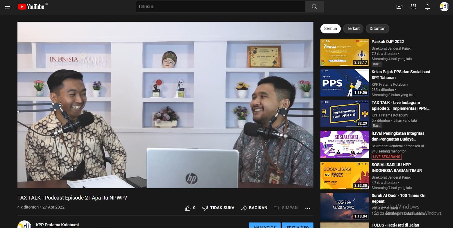 Kantor Pelayanan Pajak (KPP) Pratama membuat siniar (podcast) Tax Talk yang membahas tentang pajak di kanal resmi Youtube KPP Pratama Kotabumi dan live Instagram Pajak Kotabumi bertempat di Ruang Podcast KPP Pratama Kotabumi, Kabupaten Lampung Utara (Selasa, 21/06). Kegiatan ini telah berlangsung selama 3 (tiga) kali setiap bulannya. Acara dibawakan oleh 2 (dua) pegawai KPP Pratama Kotabumi.