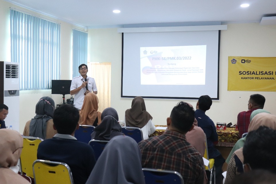 Kantor Pelayanan, Penyuluhan, dan Konsultasi Perpajakan (KP2KP) Kalianda bekerja sama dengan Kantor Pelayanan Pajak (KPP) Pratama Natar menyelenggarakan kelas pajak PMK-58/PMK.03/2022 tentang Penunjukan Pihak Lain sebagai Pemungut Pajak dan Tata Cara Pemungutan, Penyetoran, dan/atau Pelaporan Pajak yang dipungut oleh Pihak Lain atas Transaksi Pengadaan Barang dan/atau Jasa melalui Sistem Informasi Pengadaan Pemerintah, Lampung Selatan (Kamis, 03/11). Kegiatan ini diselenggarakan di Aula KP2KP Kalianda dan diikuti oleh 21 Wajib Pajak Badan Usaha Pengusaha Kena Pajak di wilayah Kabupaten Lampung Selatan.