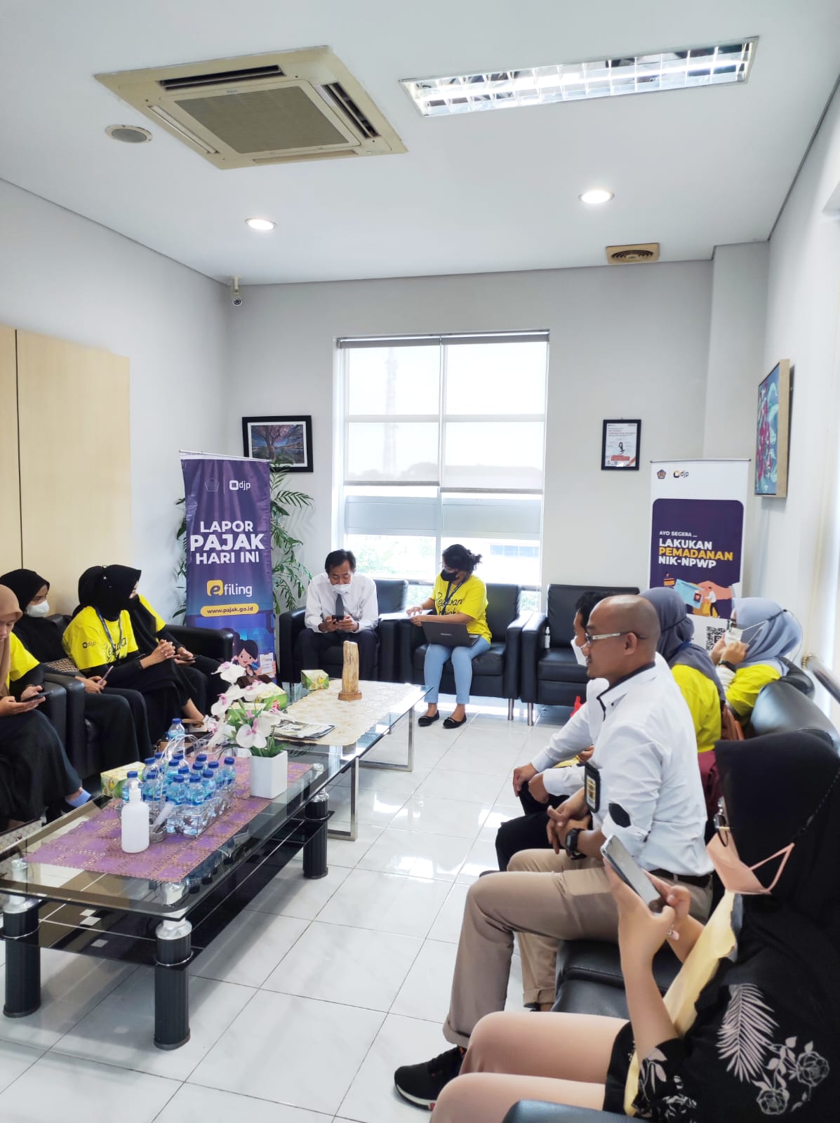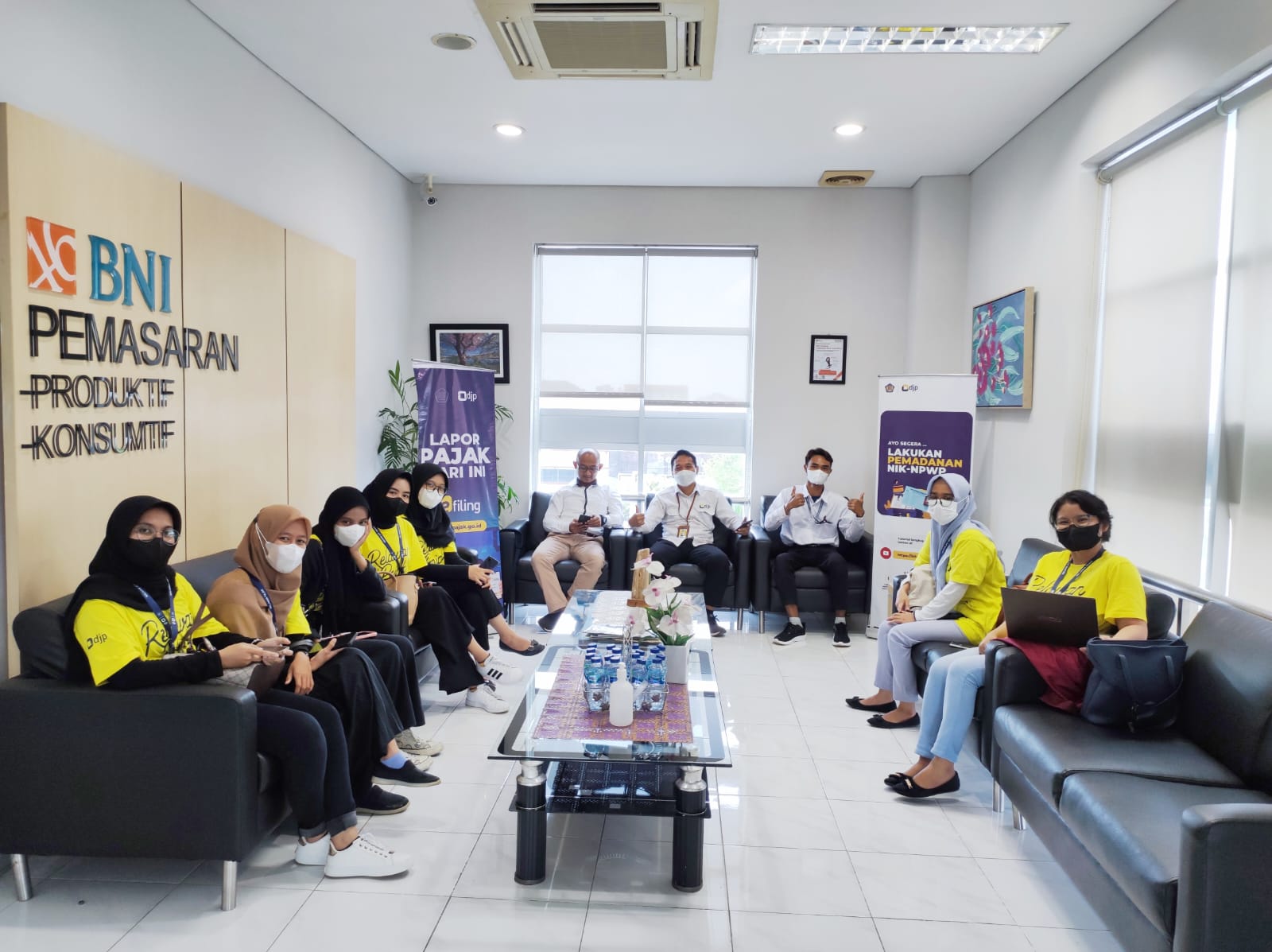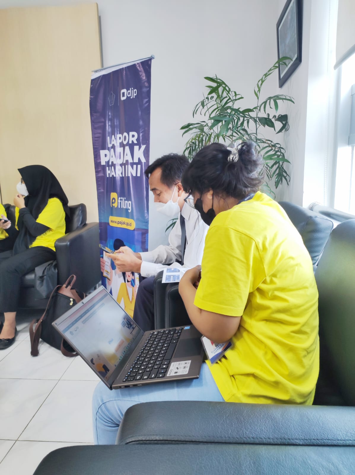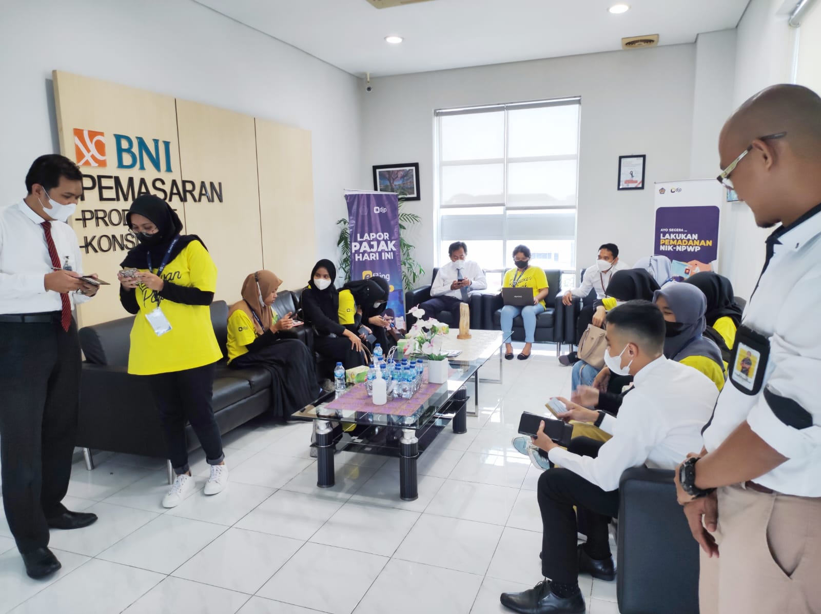 Bertempat di Ruang Pemasaran BNI KC Serang, KPP Pratama Serang Barat diwakili oleh Account Representative Singgih Prasatyohudi dan Tri Nurcahyono serta Pelaksana Seksi Pengawasan Wahyu Awalludin dan dibantu oleh 7 orang relawan pajak.
