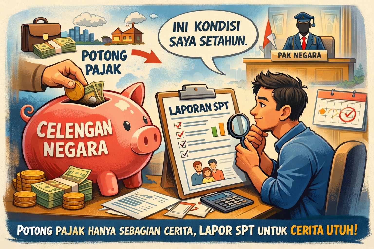 Lapor SPT tahunan kira-kira seperti itu. Kontribusi pajak bisa berupa setor sendiri atau pemotongan. SPT adalah penghitungan kembali yang seharusnya. Celengan yang Anda berikan kepada negara dilengkapi dengan rincian dan penjelasan.