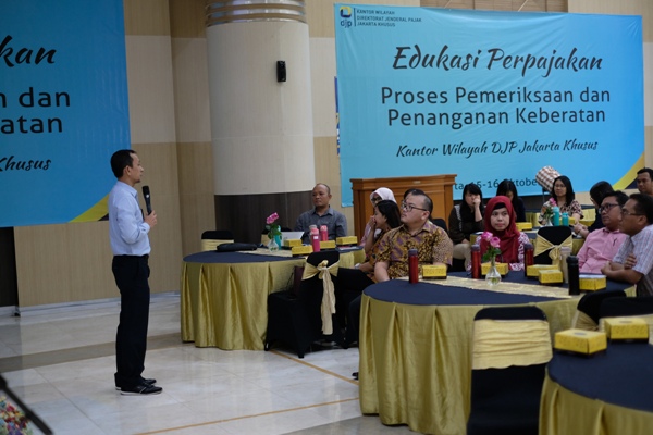 Kantor Wilayah DJP Jakarta Khusus menggelar kegiatan Edukasi Perpajakan Terkait Proses Pemeriksaan dan Penanganan Keberatan kepada 165 wajib pajak Kantor Pelayanan Pajak (KPP) Perusahaan Masuk Bursa (PMB) di Aula Sinergi, Gedung Dr. K. R. T. Radjiman Wedyodiningrat, Jakarta (Selasa, 15/10). Acara diselenggarakan selama dua hari hingga Rabu, 16 Oktober 2019.