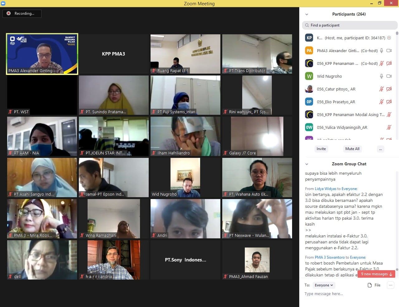 Kantor Pelayanan Pajak (KPP) Penanaman Modal Asing Tiga (KPP PMA Tiga) memberikan pelayanan prima kepada wajib pajak dengan menyelenggarakan edukasi aplikasi e-Faktur 3.0 secara daring melalui aplikasi telekonferensi Zoom Meeting di Jakarta (Selasa, 22/9). Kegiatan edukasi ini dikuti oleh 170 wajib pajak yang telah melakukan registrasi sebelumnya