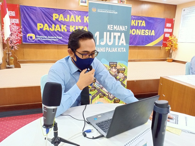 Sebanyak 28 bendahara pemerintah pusat di Kabupaten Bojonegoro mengikuti sosialisasi perpajakan bendahara mahir pajak yang diadakan Kantor Pelayanan Pajak (KPP) Pratama Bojonegoro secara daring melalui aplikasi Zoom Meeting di KPP Pratama Bojonegoro (Rabu, 24/6). Sosialisasi ini bertujuan untuk mengingatkan kembali kewajiban perpajakan bendahara mengenai tata cara pemotongan/pemungutan, pembayaran, dan pelaporan sehingga dapat melaksanakan dan mempertanggungjawabkan aspek perpajakan sebagaimana mestinya.