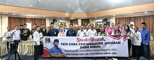 Badan Kesatuan Bangsa dan Politik Kabupaten Lampung Timur menggandeng Kantor Pelayanan Pajak Pratama (KPP) Metro dalam Kegiatan Sosialisasi Tata Cara Pertanggungjawaban Dana Hibah bagi Penerima Hibah Tahun Anggaran 2024 di Aula Sekretariat Daerah Kabupaten Lampung Timur (Rabu, 25/9). Kegiatan sosialisasi ini dihadiri oleh penerima hibah Kabupaten Lampung timur tahun 2024 sebanyak tujuh puluh orang pengurus dari dua puluh sembilan Lembaga Swadaya Masyarakat (LSM) dan/atau Organisasi Kemasyarakatan (Ormas).