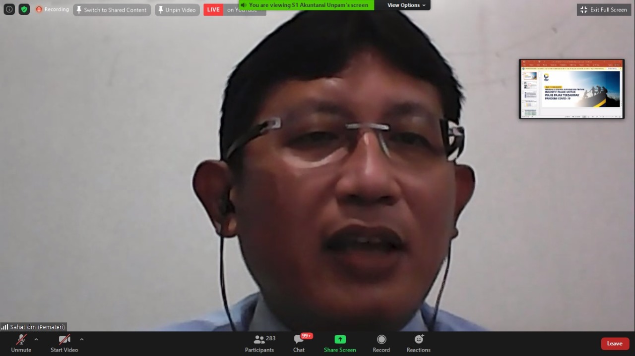 Mengusung tema "Insentif Pajak untuk Wajib Pajak Terdampak Covid-19", Kantor Wilayah DJP Banten ditampuk sebagai narasumber pada kegiatan seminar nasional secara daring bekerja sama dengan Tax Center Universitas Pamulang di Serang, Banten (Rabu, 30/9). Seminar nasional ini merupakan bagian dari rangkaian perayaan hari ulang tahun Tax Center Universitas Pamulang ke-6 yang diikuti oleh lebih dari 300 mahasiswa dan dosen dari Universitas Pamulang.