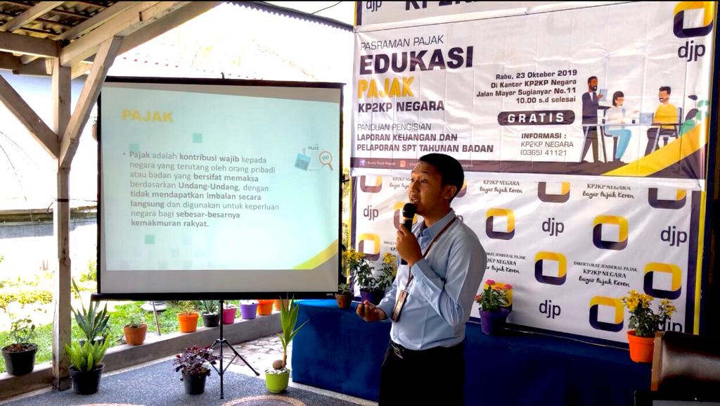 Edukasi ini dilakukan oleh KP2KP Negara sebagai rangkaian acara Pasraman Pajak (Edukasi Perpajakan) KP2KP Negara dalam rangka memberikan edukasi kepada Subak maupun Yayasan dalam memenuhi kewajiban perpajakannya. Peserta edukasi merupakan perwakilan dari Kelian (Ketua) Subak dan Yayasan di Kabupaten Jembrana. Peserta tampak antusias mengikuti acara Edukasi Perpajakan ini. Perserta berharap acara Edukasi ini tetap berlanjut dan berharapa ikut serta membangun bangsa dengan membayar pajak.