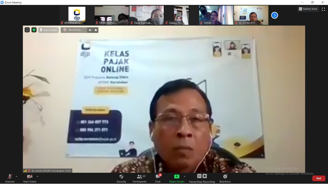 KPP Pratama Badung Utara dan KP2KP Kerobokan berkolaborasi dalam webinar (seminar web) tentang ketentuan NPWP Instansi Pemerintah melalui aplikasi Zoom Meeting yang dilangsungkan di KPP Pratama Badung Utara, Denpasar, Bali (Selasa, 30/06). Webinar kali ini diikuti oleh 40 bendahara desa di wilayah Kabupaten Badung.
