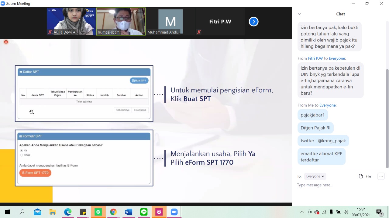 Kanwil DJP Jawa Barat I kembali menggelar bimbingan teknis SPT Tahunan secara daring di Bandung (Senin, 8/3). Kali ini, kegiatan dilakukan kepada sekitar 40-an peserta Relawan Pajak Universitas Islam Negeri Sunan Gunung Djati (UIN SGD) Bandung.