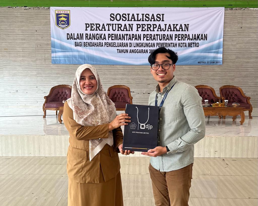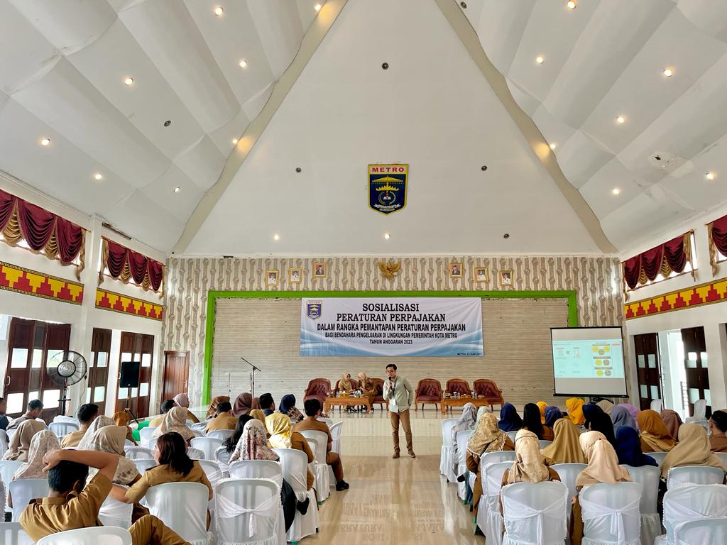 Kantor Pelayanan Pajak (KPP) Pratama Metro menggelar sosialisasi peraturan perpajakan terkait kewajiban bendahara pemerintah sekaligus penerapan aplikasi elektronik bukti potong (e-Bupot) unifikasi bagi Instansi Pemerintah se-Kota Metro di Gedung Wisma Haji Al Khairiyah, Jalan Mr Gele Harun No 20, Kota Metro, Provinsi Lampung (Selasa, 27/6).