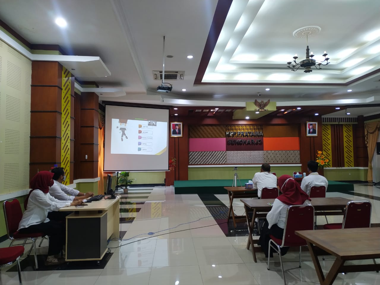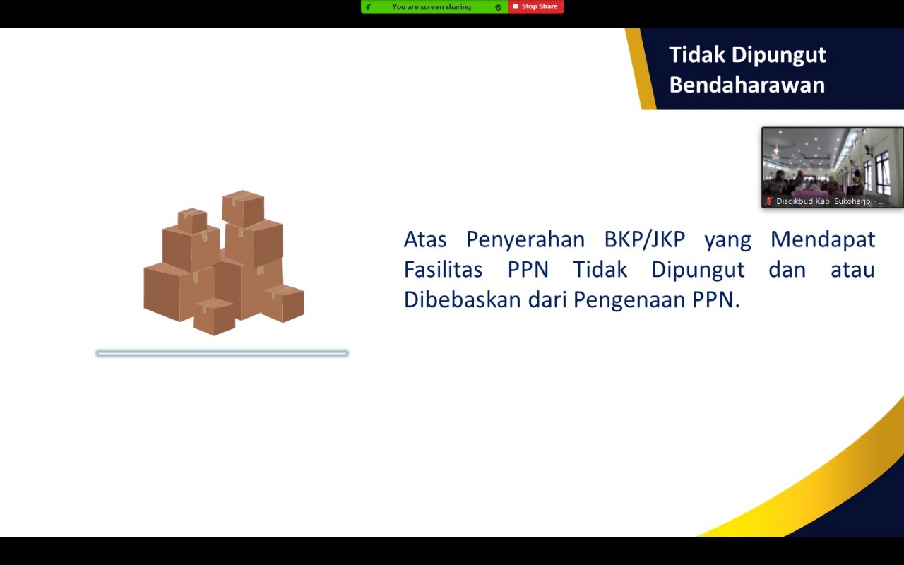 Kantor Pelayanan Pajak (KPP) Pratama Sukoharjo menyelenggarakan sosialisasi kewajiban perpajakan bagi bendahara BOS se-Kabupaten Sukoharjo melalui media telekonferensi di aula KPP Pratama Sukoharjo (Selasa, 22/9).