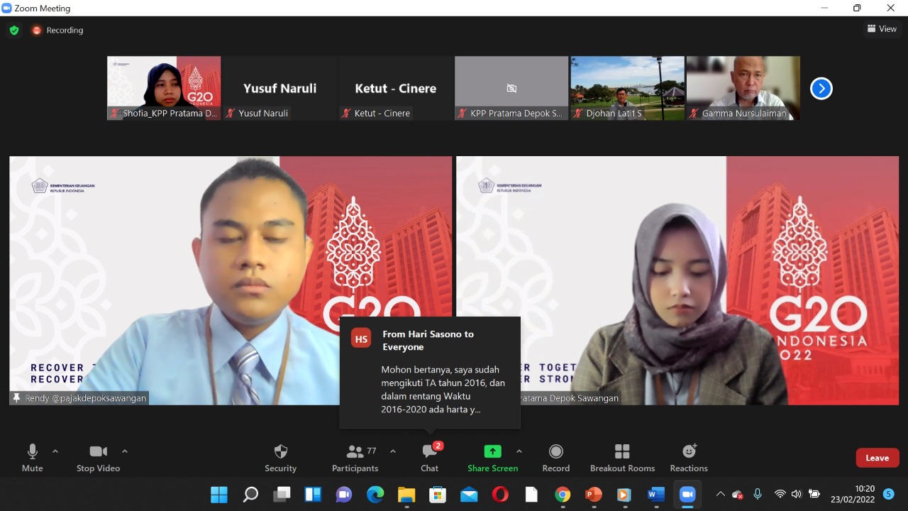 Kantor Pelayanan Pajak (KPP) Pratama Depok Sawangan kembali menggelar Kelas Pajak Program Pengungkapan Sukarela (PPS). Acara yang dipandu langsung dari Depok, Jawa Barat ini digelar secara virtual melalui Aplikasi Zoom Meeting (Rabu, 23/2).