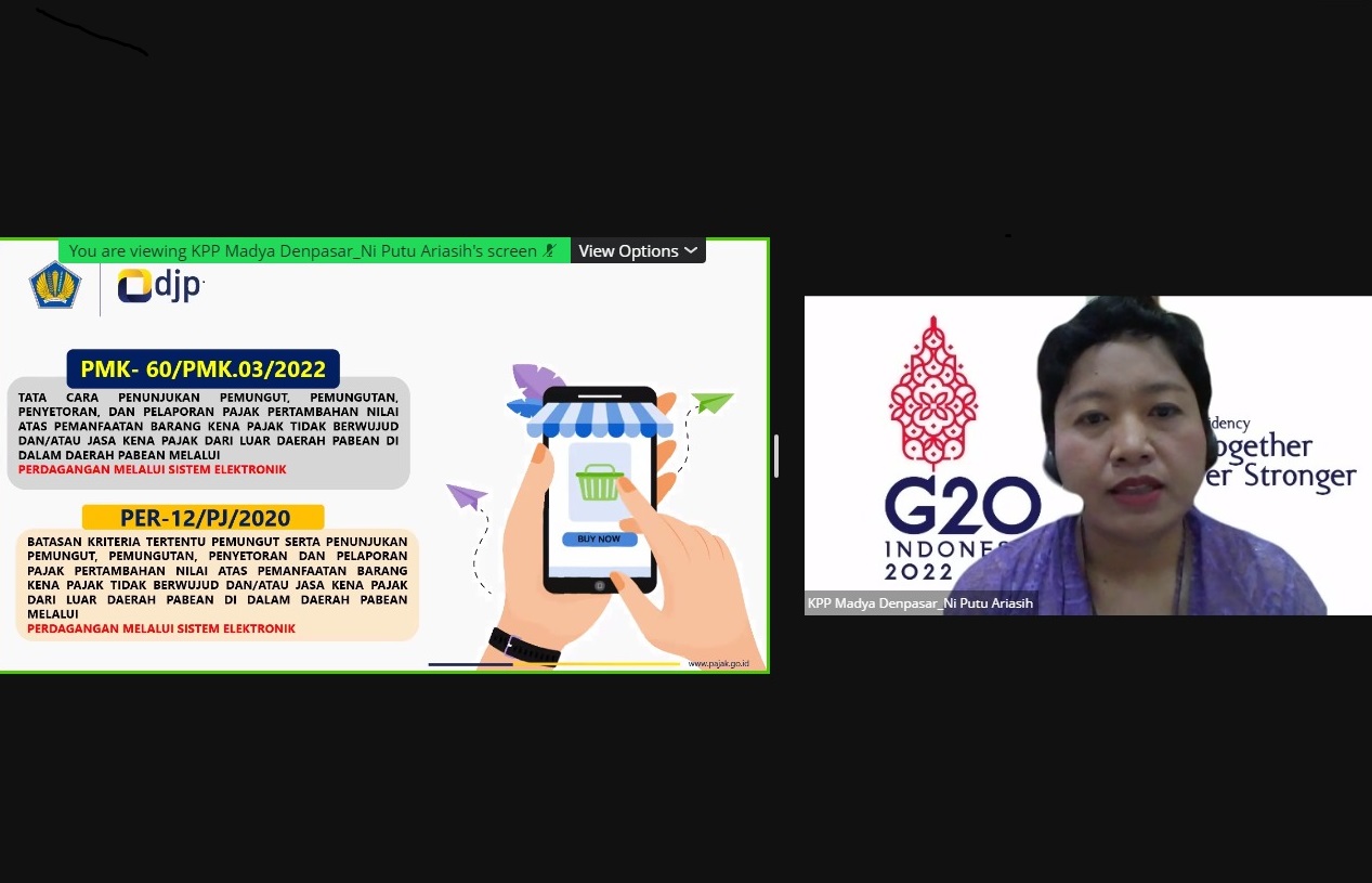Kantor Pelayanan Pajak (KPP) Madya Denpasar kembali mengadakan kelas pajak dengan topik aturan turunan Undang–Undang Harmonisasi Peraturan Perpajakan (HPP) yang dihadiri oleh 71 Wajib Pajak Badan secara daring melalui kanal Zoom Meeting di Denpasar, Bali (Kamis, 23/06).