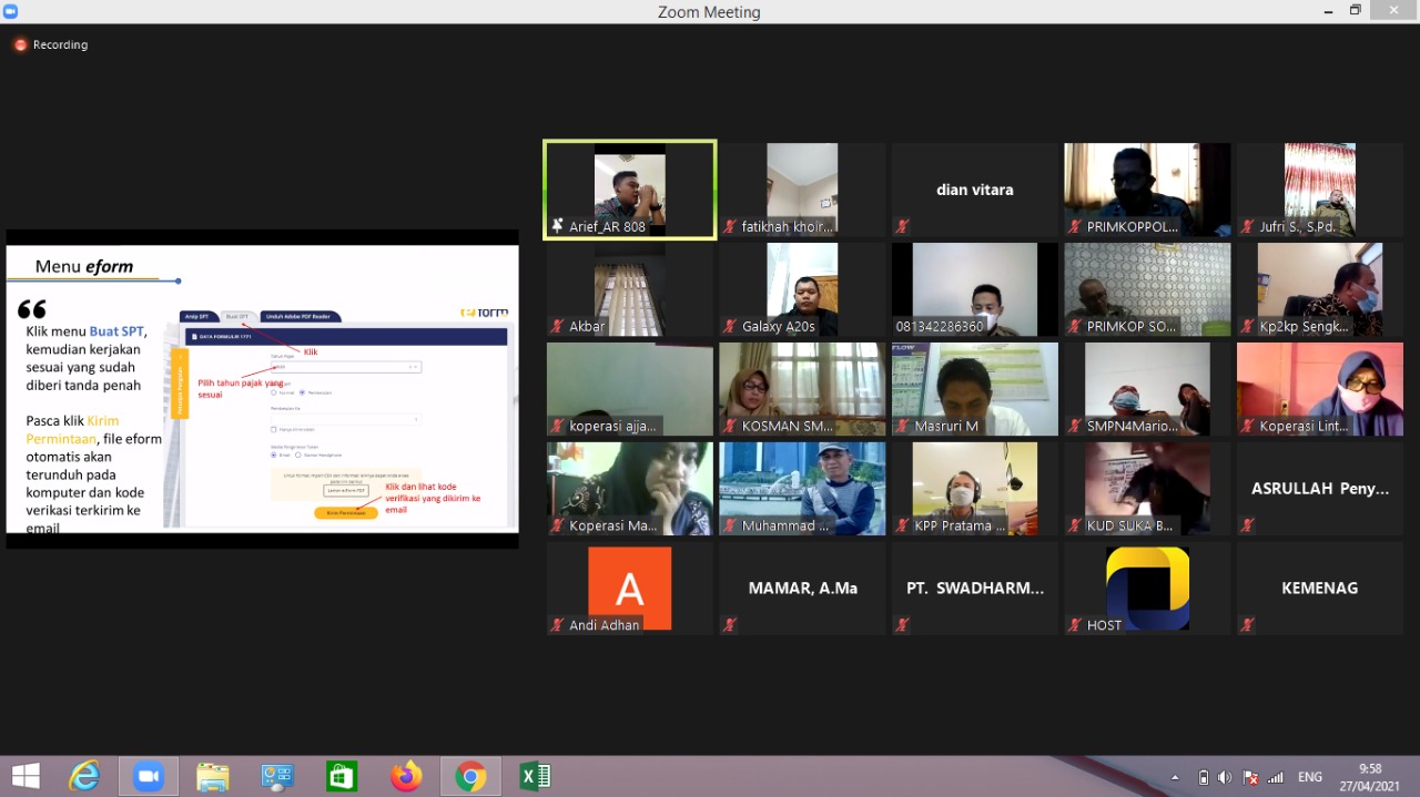 Kantor Pelayanan, Penyuluhan, dan Konsultasi Perpajakan (KP2KP) Sengkang mengadakan kelas pajak secara daring mengenai Tata Cara Melapor SPT Tahunan Badan 2020 melalui e-Form di Kabupaten Wajo, Sulawesi Selatan (Selasa, 27/4).