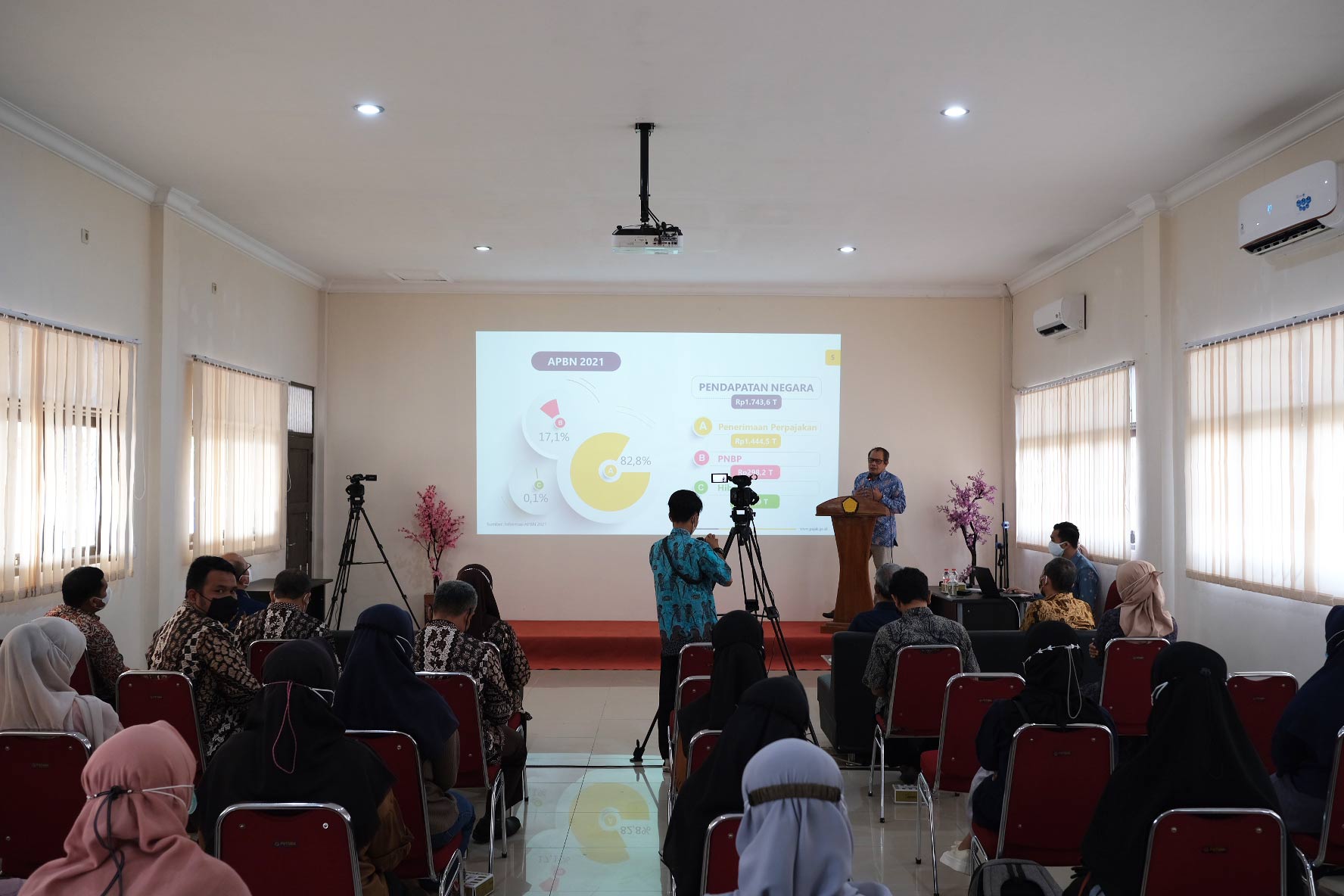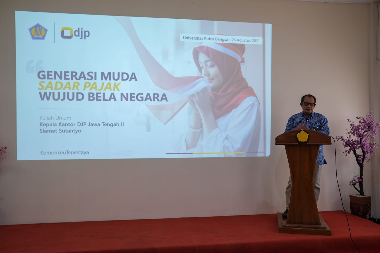 Kepala Kantor Wilayah (Kanwil) DJP Jawa Tengah II Slamet Sutantyo memberikan kuliah umum kepada mahasiswa Universitas Putra Bangsa (UPB) Kebumen secara hybrid di Aula UPB, Kebumen (Kamis, 26/8).