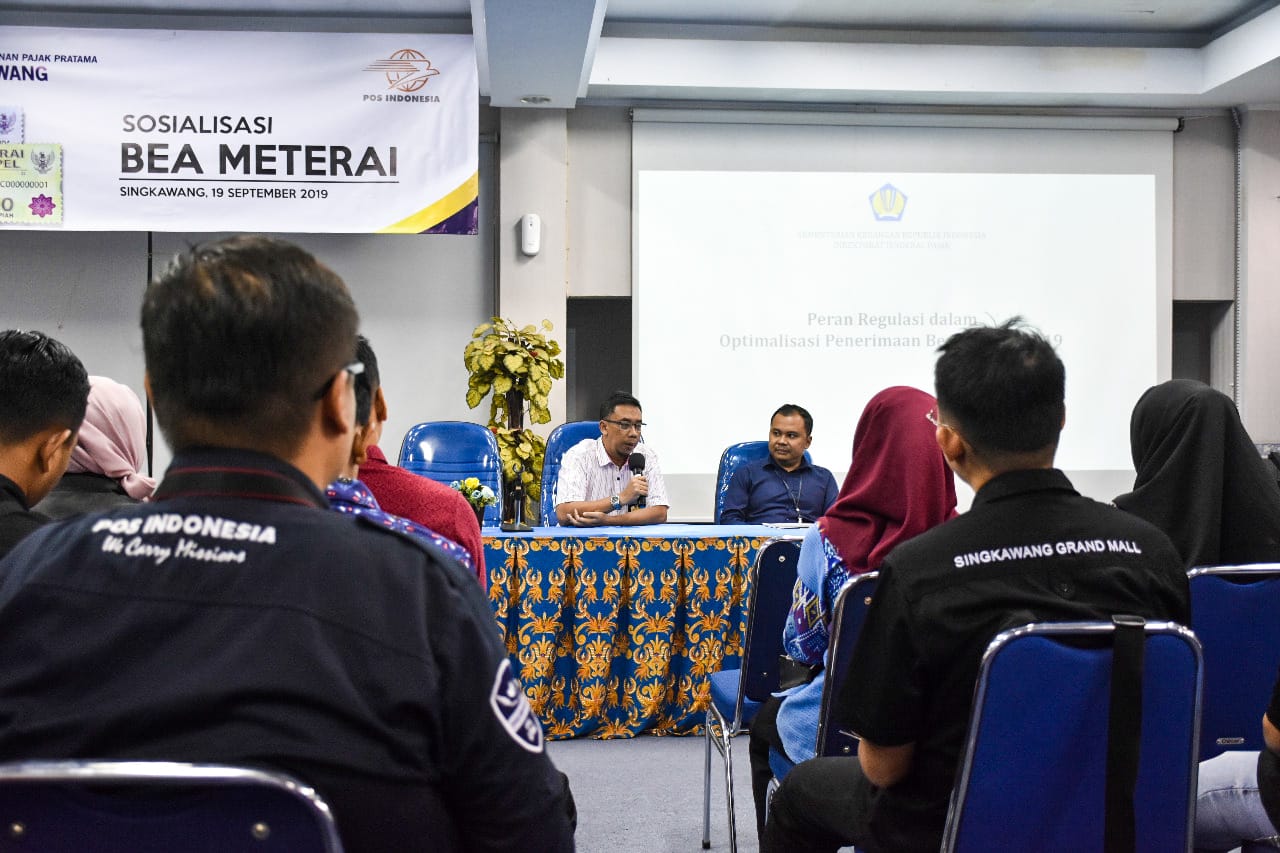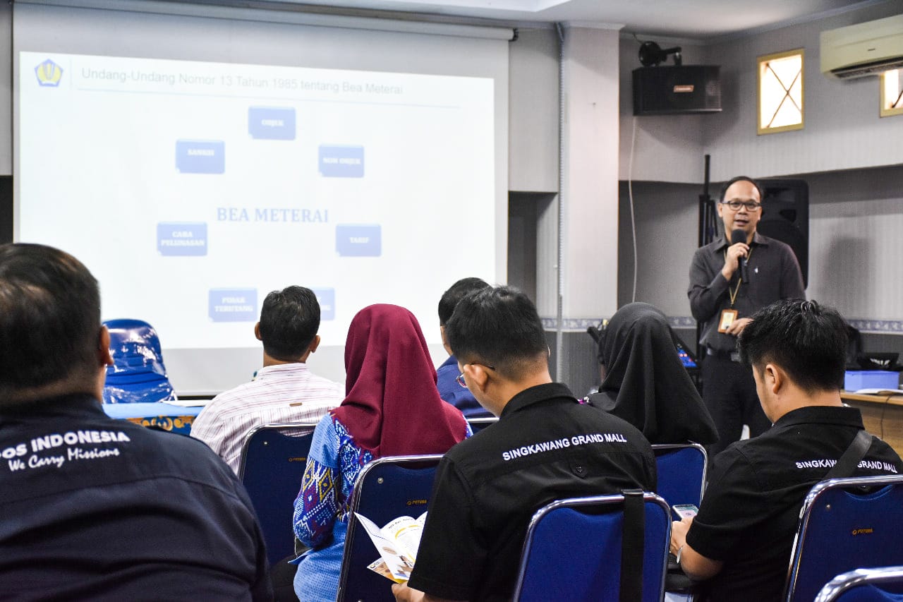 KPP Pratama Singkawang bekerja sama dengan Kantor Pos Indonesia cabang Kota Singkawang menggelar Sosialisasi Bea Meterai di aula lantai dua KPP Pratama Singkawang (Kamis, 19/9).