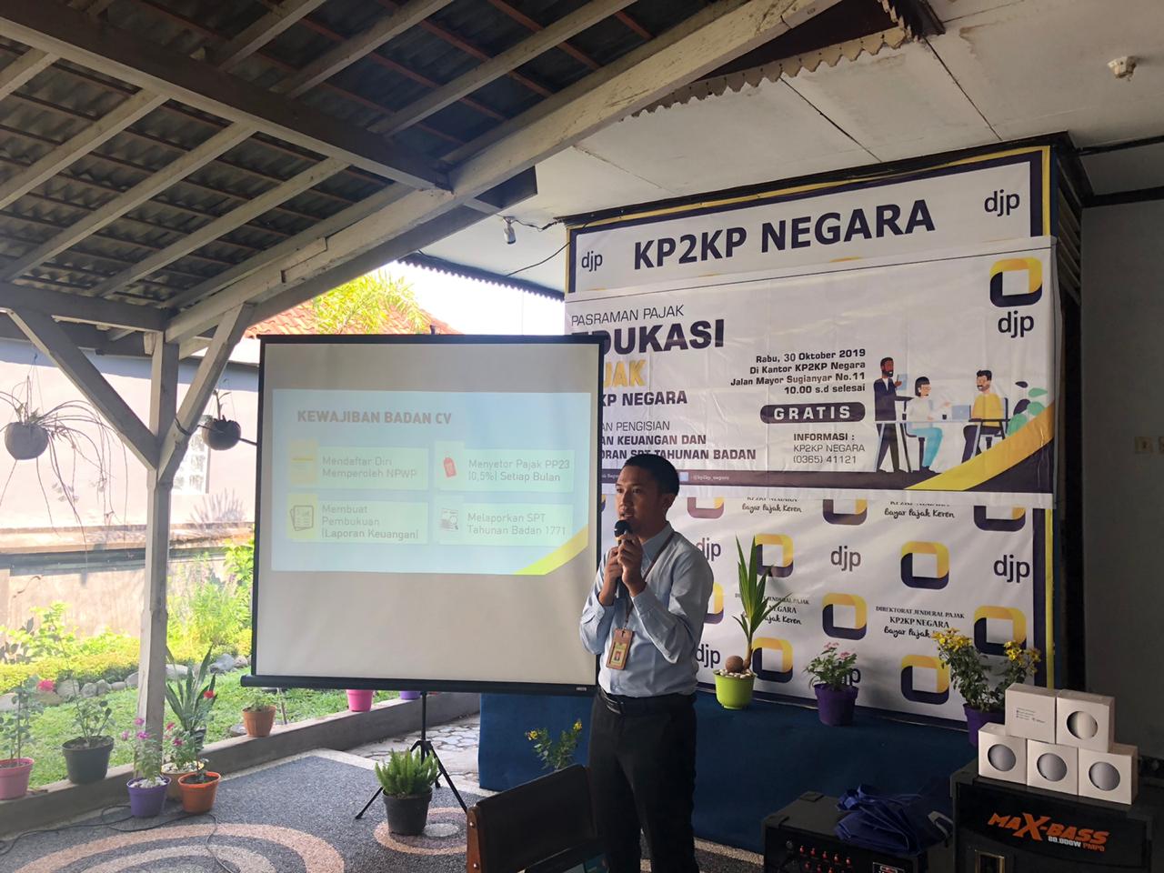 Kantor Pelayanan, Penyuluhan dan Konsultasi Perpajakan (KP2KP) Negara menggelar kegiatan edukasi perpajakan bagi wajib pajak badan bertempat di Taman Belakang KP2KP Negara (Rabu, 30/10). Kegiatan ini dihadiri oleh 17 wajib pajak badan CV di Kabupaten Jembrana.