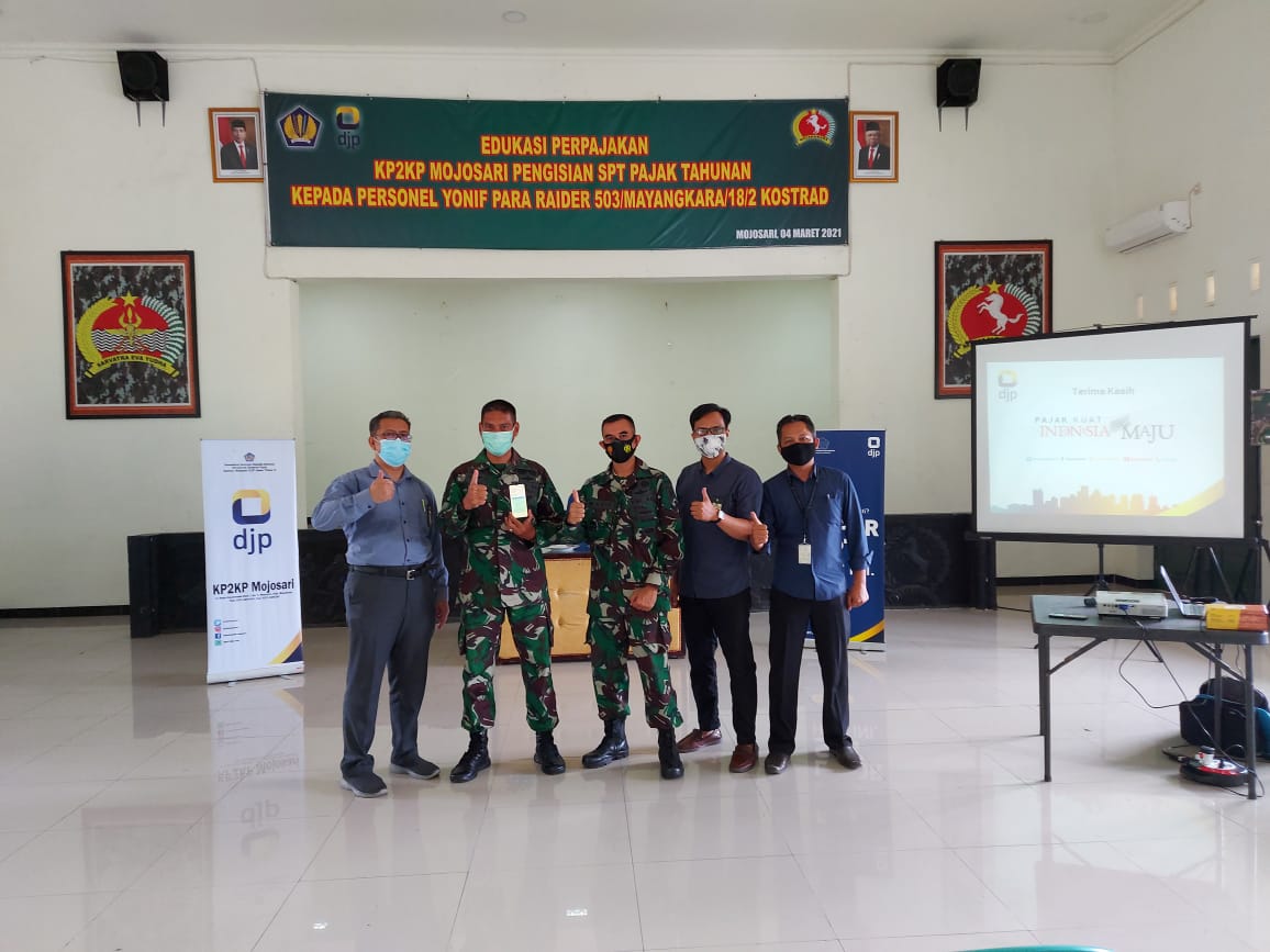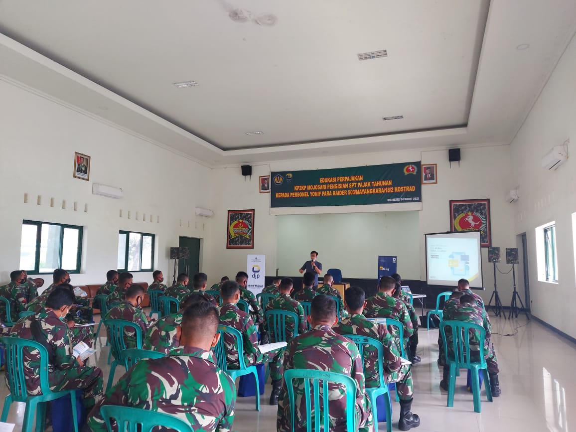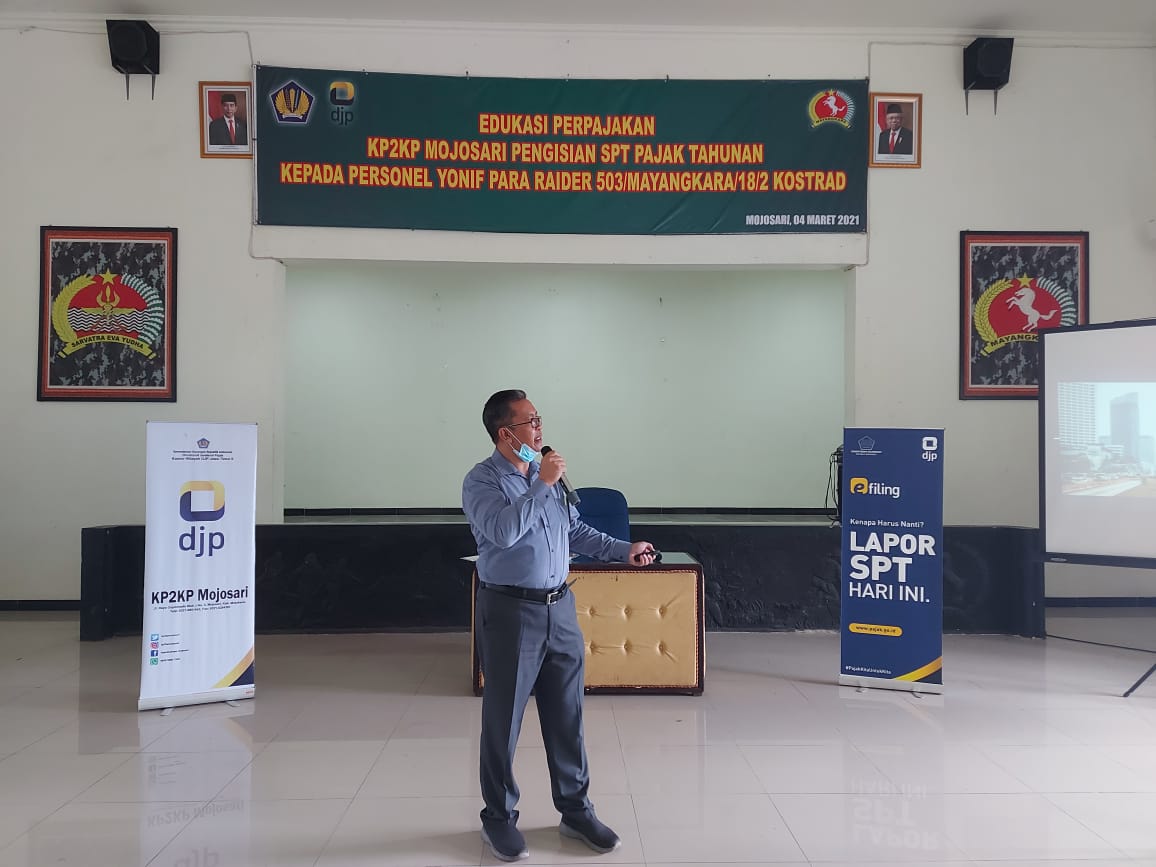 Kantor Pelayanan Penyuluhan dan Konsultasi perpajakan (KP2KP) Mojosari melakukan edukasi perpajakan dan bimbingan teknis terkait pengisian SPT Tahunan melalui e-Filing bertempat di Aula Djarot Yonif Para Rider 503, Mojosulur, Mojokerto (Kamis, 4/3). Kepala KP2KP Mojosari Rahmat Basuki memberikan sambutan pada acara yang diikuti puluhan anggota TNI di lingkungan Yonif Para Raider 503 tersebut.