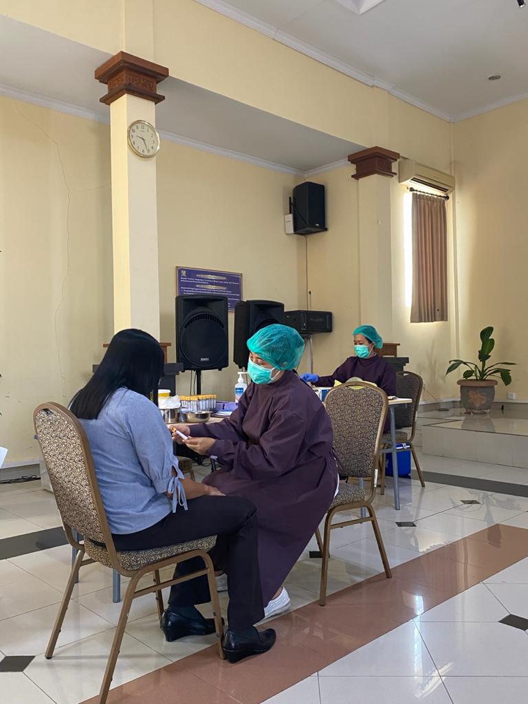 Bekerja sama dengan Laboraturium Prodia Gianyar, tes cepat yang dilaksanakan rutin setiap bulan ini diselenggarakan untuk mencegah penularan Covid-19. Dalam pelaksanaannya, seluruh pegawai menerapkan protokol kesehatan dengan menjaga jarak fisik satu sama lain.