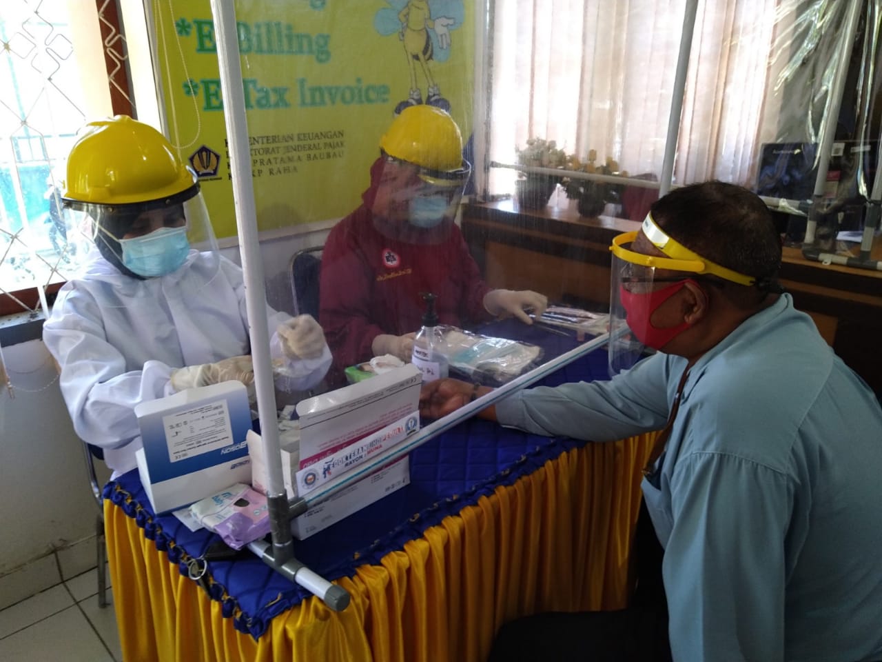 Kantor Pelayanan, Penyuluhan, dan Konsultasi Perpajakan (KP2KP) Raha melaksanakan kegiatan pemeriksaan rutin rapid test Covid-19 di ruang tempat pelayanan terpadu KP2KP Raha di Kabupaten Muna (Rabu 26/8). Kegiatan ini terlaksana berkat kerja sama antara KP2KP Raha dengan petugas kesehatan dari Puskesmas Sugilaende.