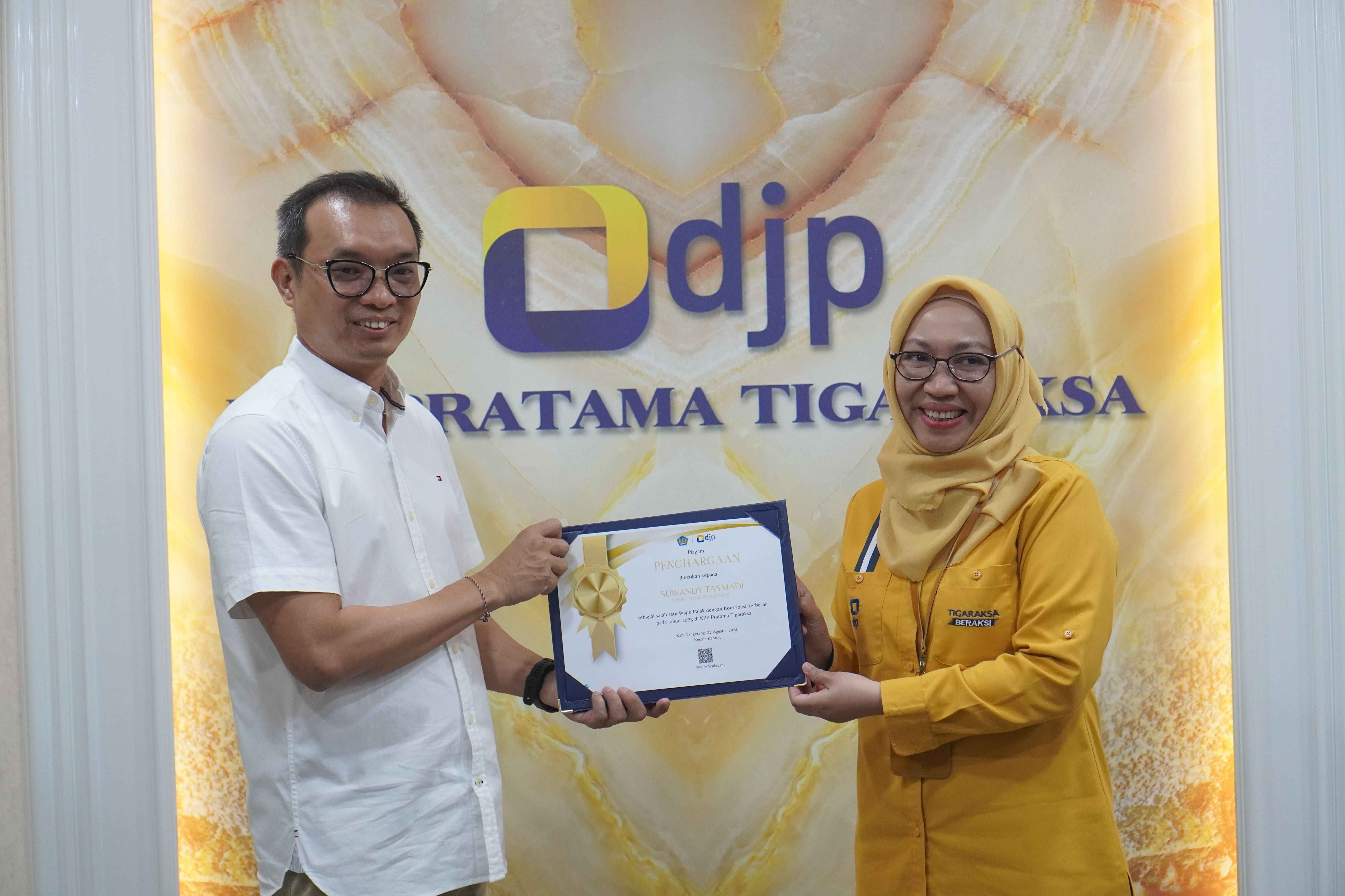 Kantor Pelayanan Pajak (KPP) Pratama Tigaraksa berikan piagam penghargaan kepada salah satu wajib pajak atas peran serta dalam pencapaian kinerja KPP pada tahun 2023. Salah satu wajib pajak yang mendapatkan penghargaan adalah Suwandy Tasmadi. Penyampaian penghargaan dilakukan di ruang podcast KPP Pratama Tigaraksa (Selasa, 27/8).
